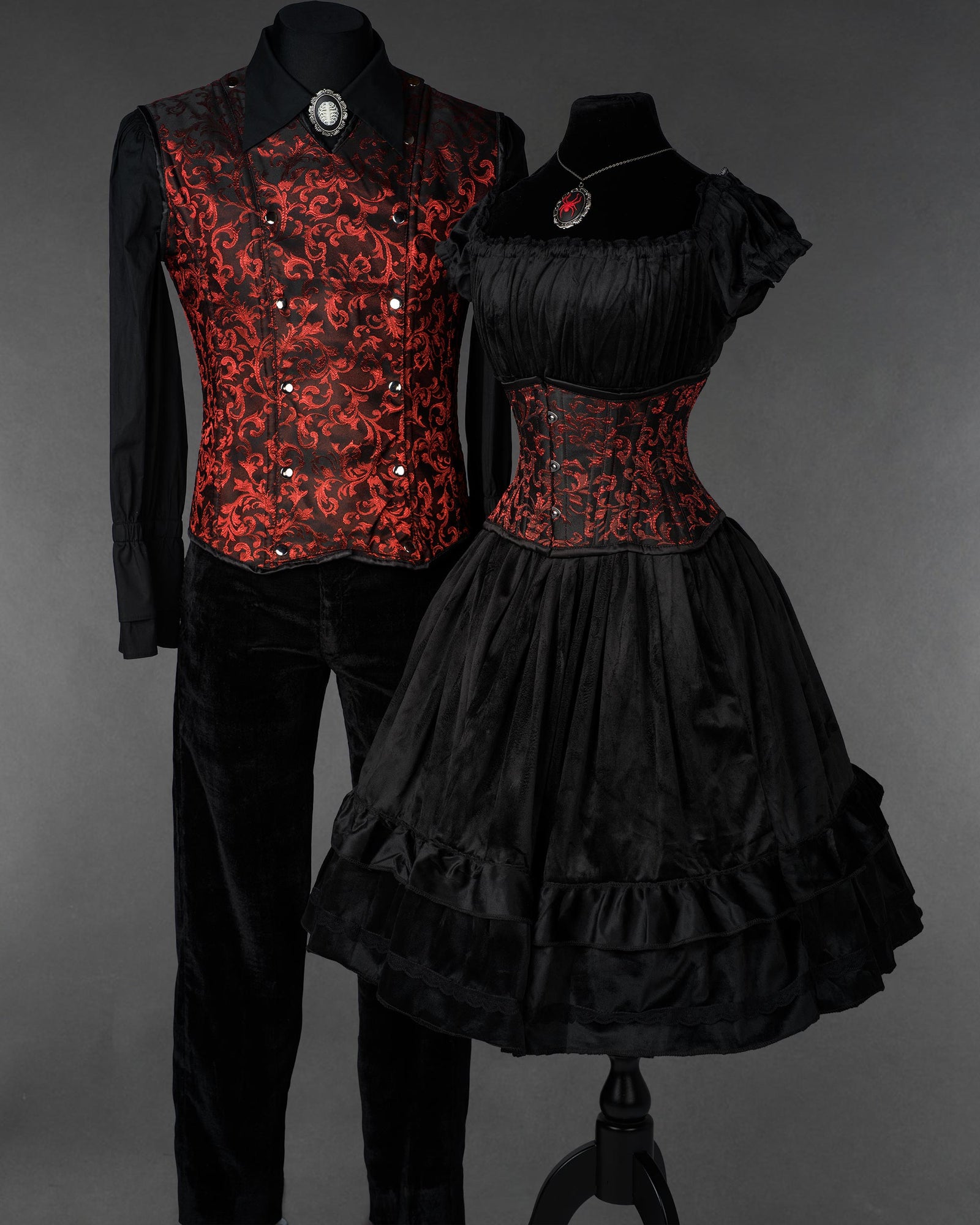 This male corset is mainly crafted from black brocade fabric, accented by red brocade on the sides and finished with faux leather piping along the seams. It has thick cotton lining on the inside for strength and comfort.