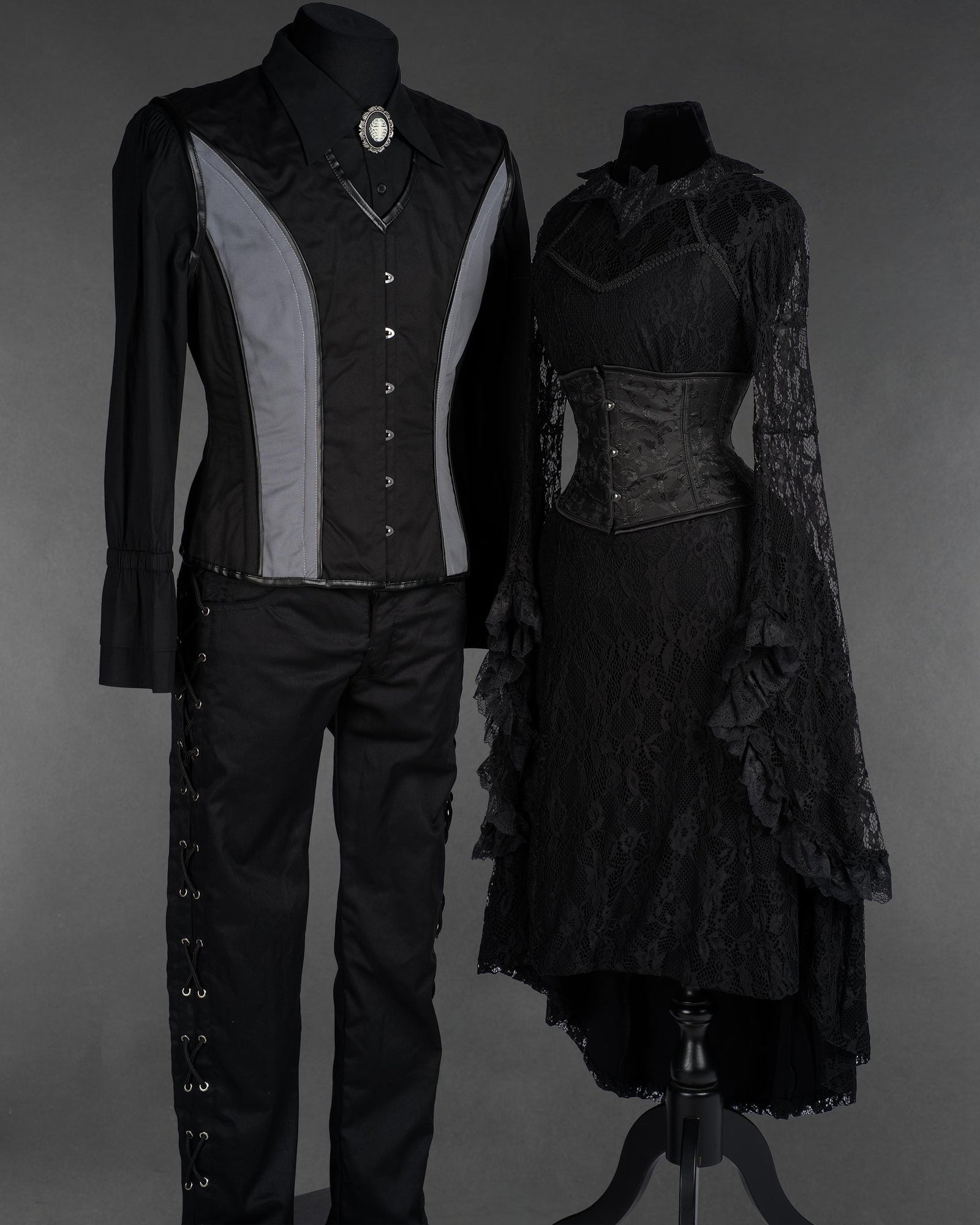 This male corset is mainly crafted from black brocade fabric, accented by red brocade on the sides and finished with faux leather piping along the seams. It has thick cotton lining on the inside for strength and comfort.