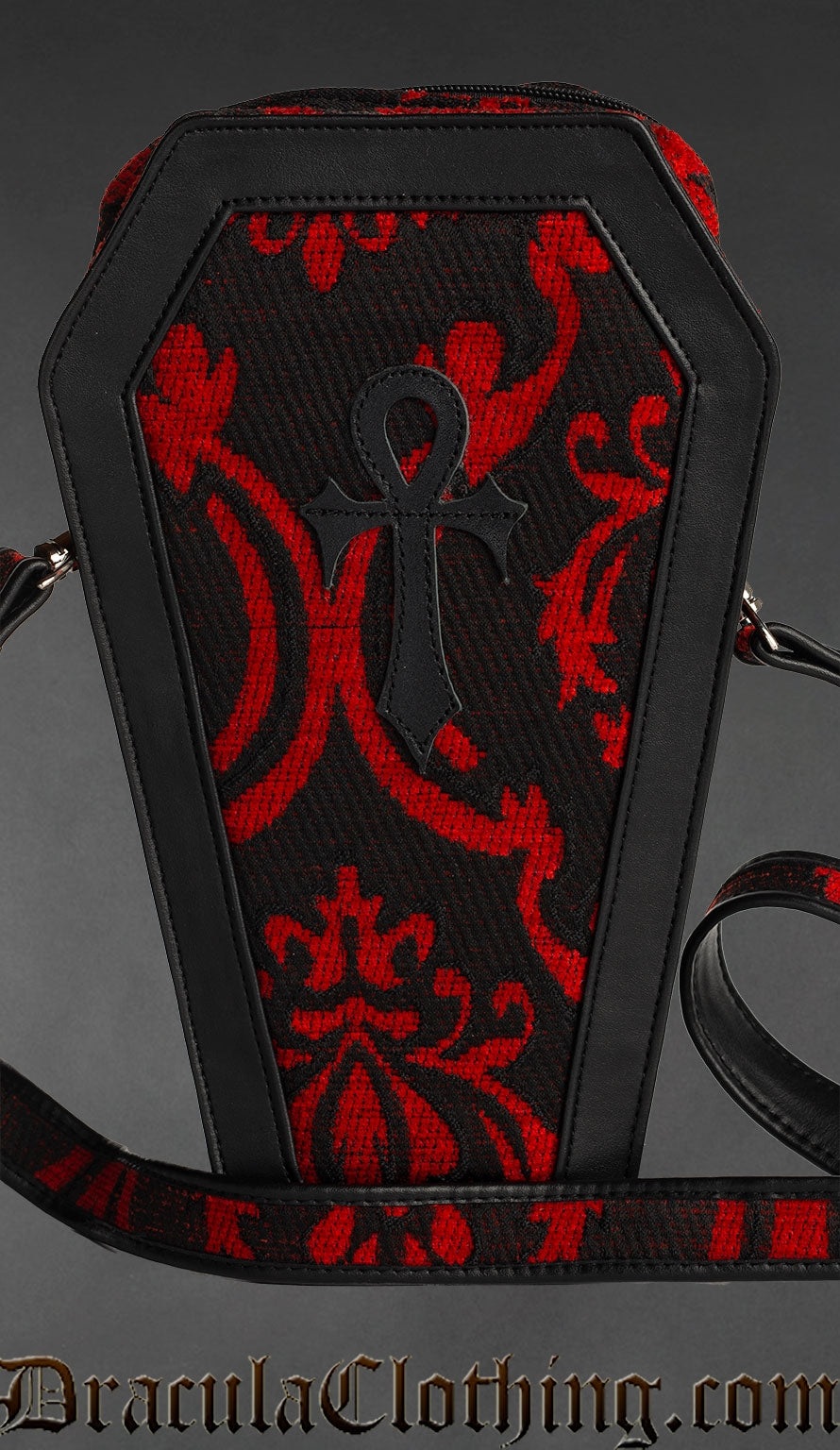 Black and red brocade fabric bag shaped like a coffin with faux leather details.