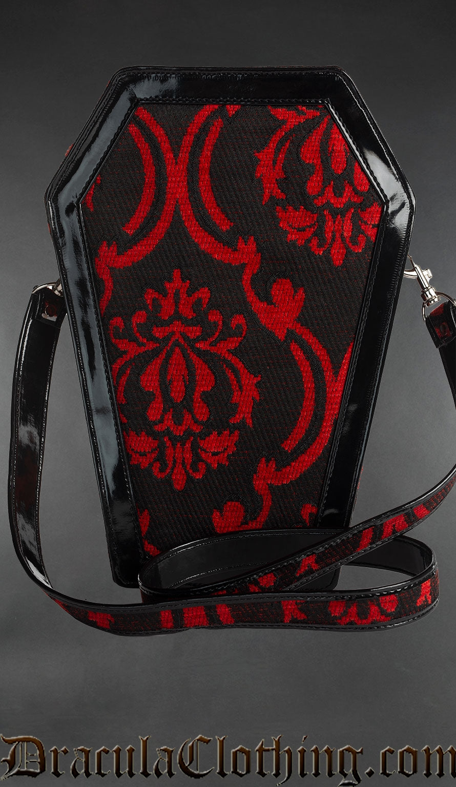 It has red brocade fabric with PVC details, with one big compartment and one small compartment inside.