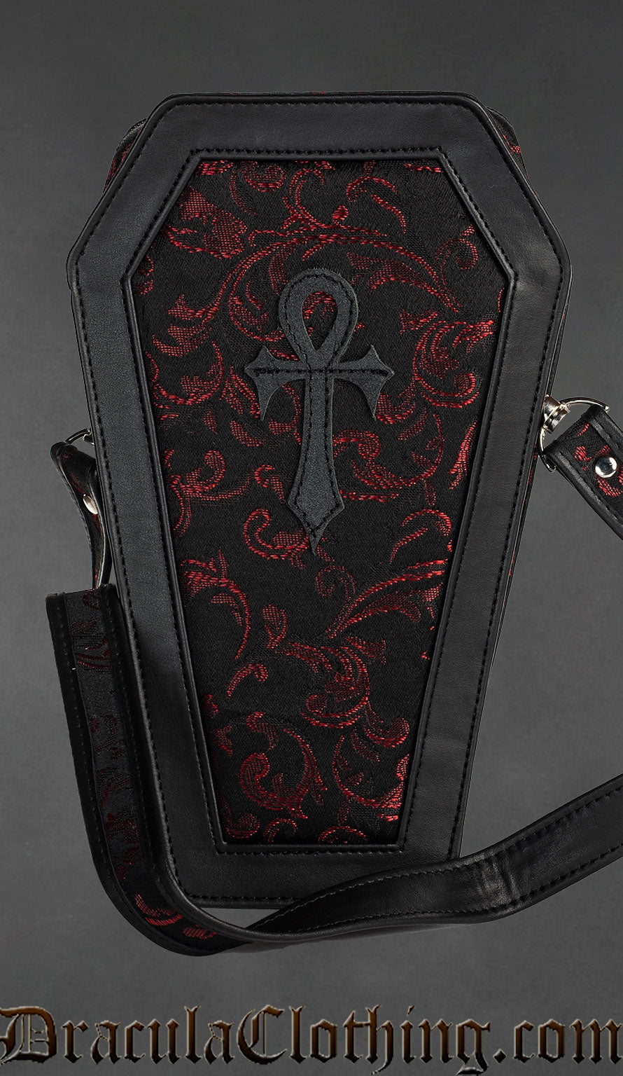 Black and red brocade fabric bag shaped like a coffin with faux leather details.