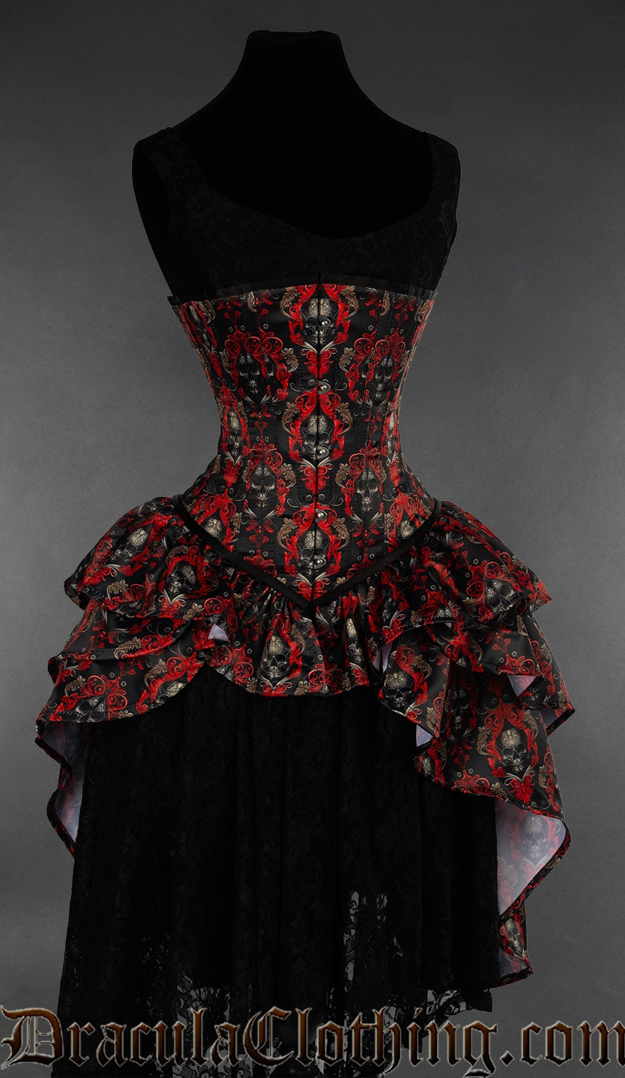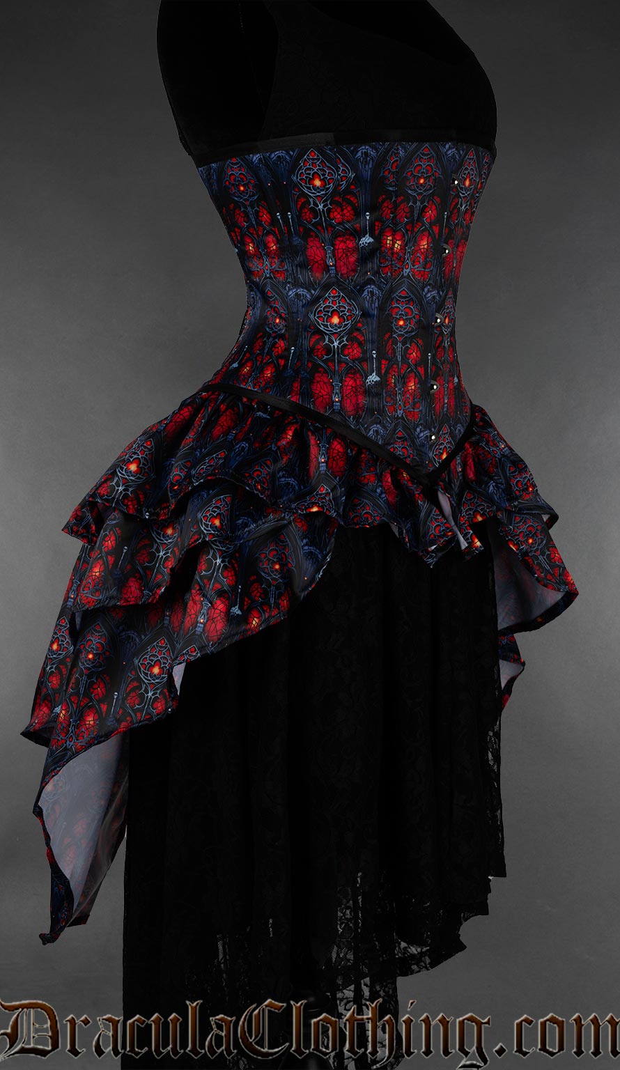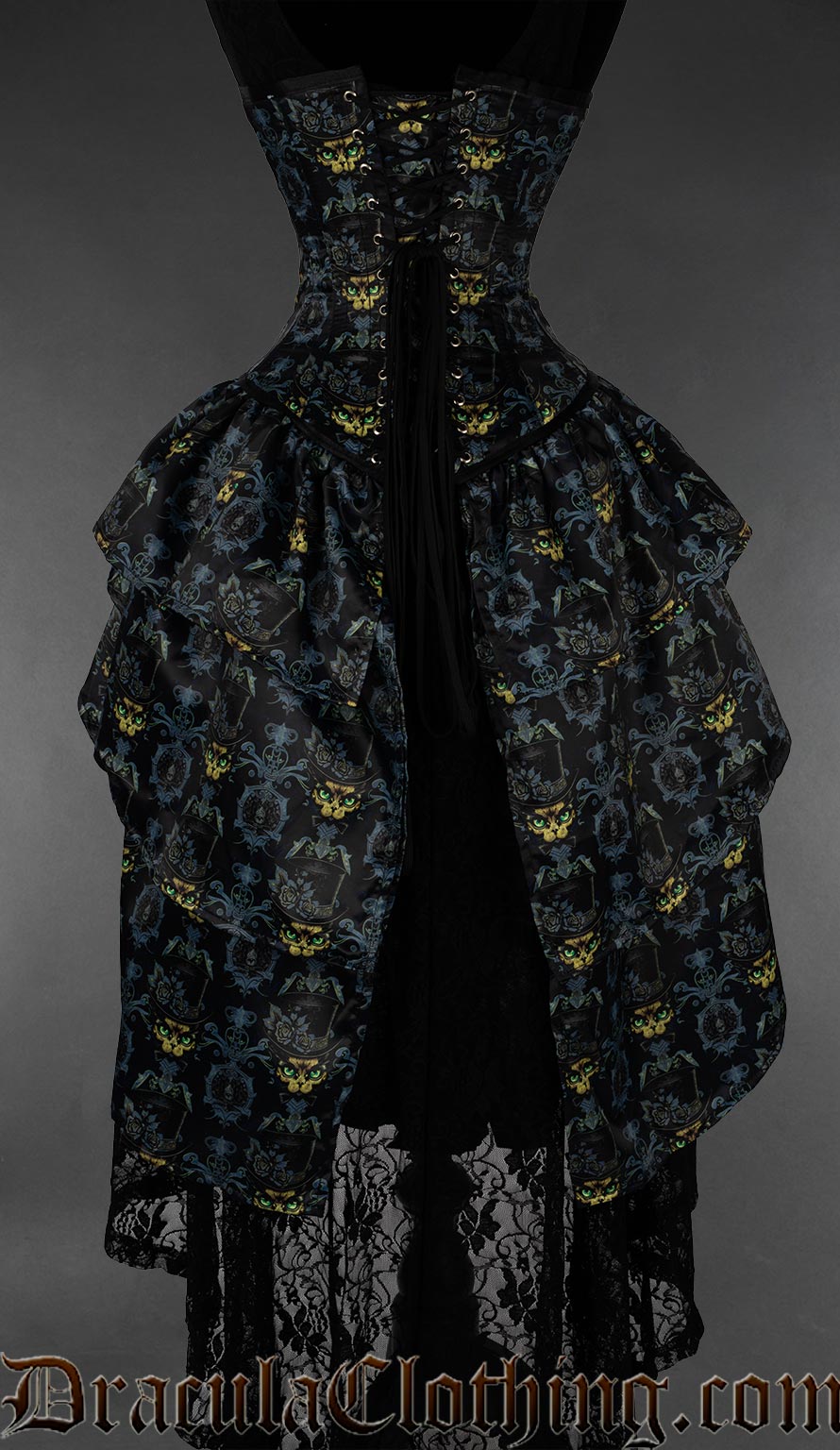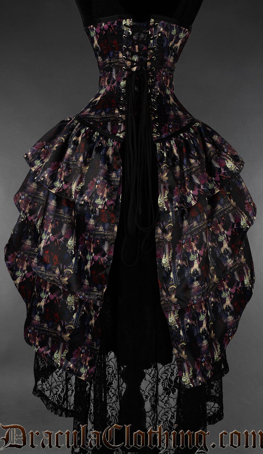 Explore our range of bustle corsets - available in a large variety of fabrics, prints and colours. The corsets have spiral metal boning in the side, flat metal busk in the front and back, and feature a layered bustle-style skirt attached to the base of the corset. Get the striking corset and bustle skirt silhouette with one item of clothing!