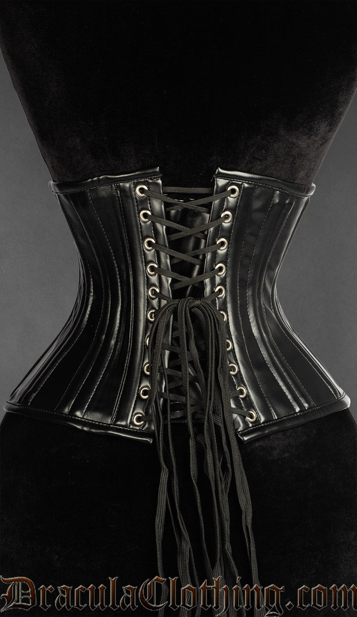 The black faux leather extreme waist cincher is made with black faux leather on the outside and black cotton lining on the inside.