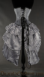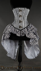 The Striped Bustle Corset is made with a black and white stripe print on the outside and cotton lining on the inside. This corset has an attached skirt