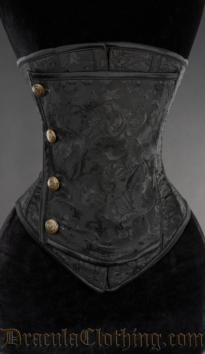 Made with high quality black brocade fabric and black satin piping on the edges. Featuring a front panel that covers the front busk, attached with gold-coloured buttons.