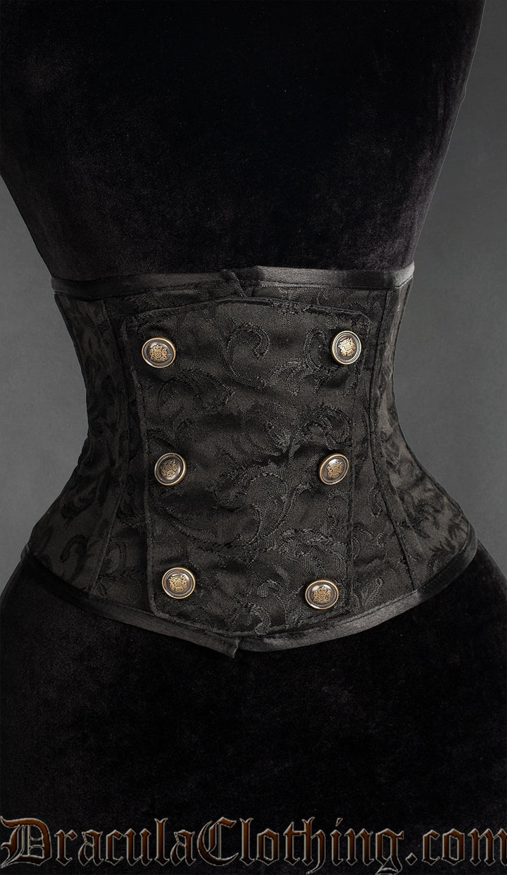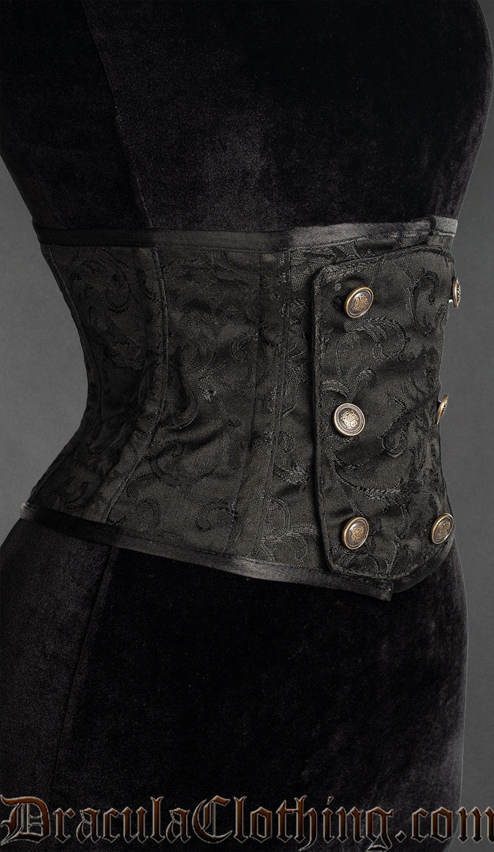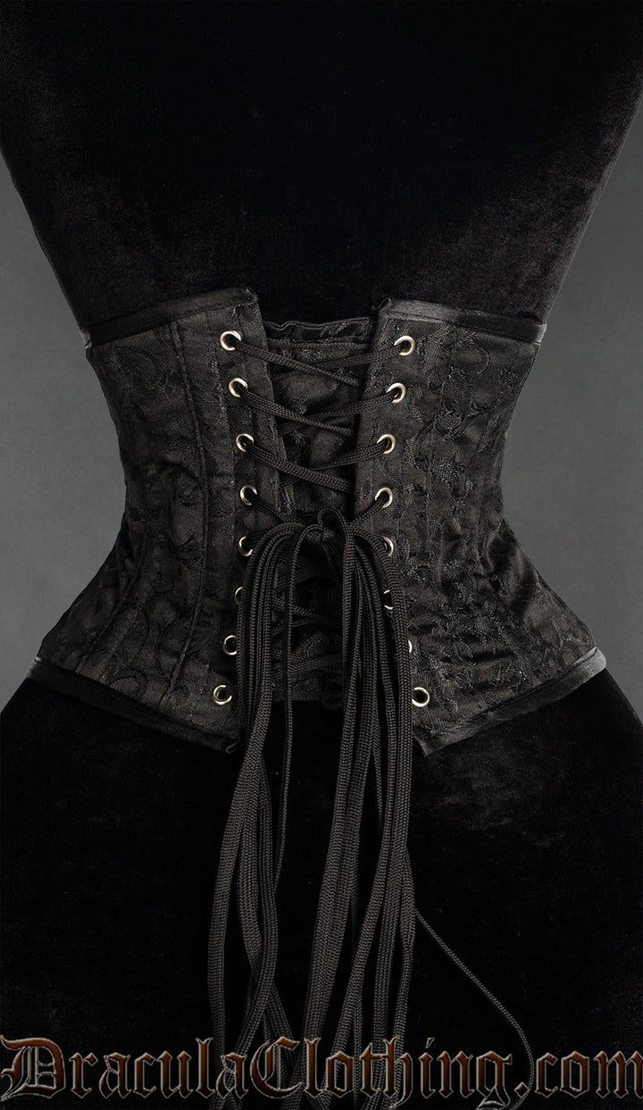 The Black brocade waist cincher is made with black brocade on the outside and cotton lining on the inside.