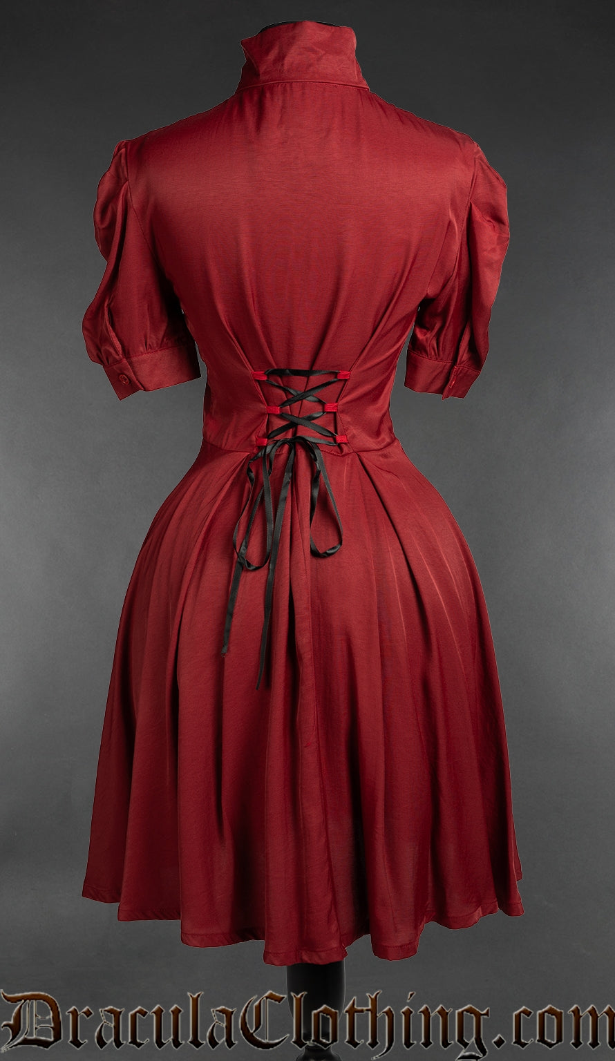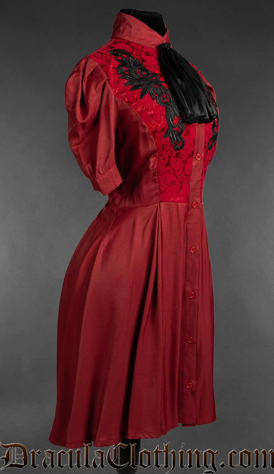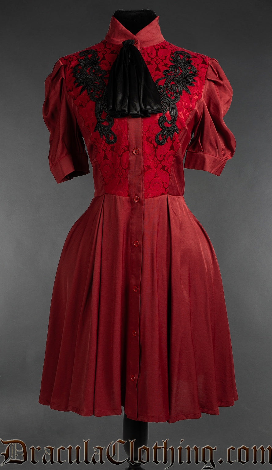 - Red shirtdress with intricate black embroidered details and a red brocade panel on the chest