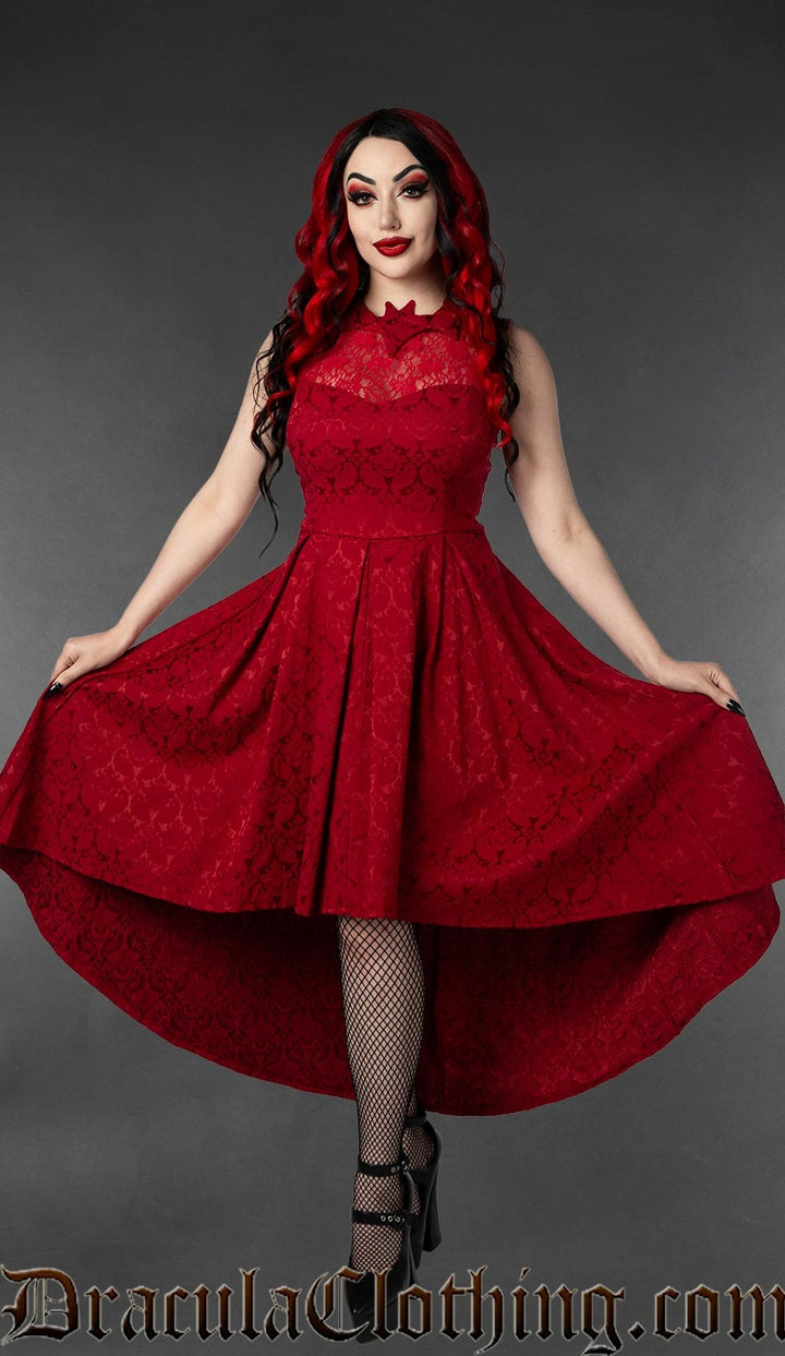 Women's red brocade high low dress with sheer lace chest panel topped with a bat shaped collar