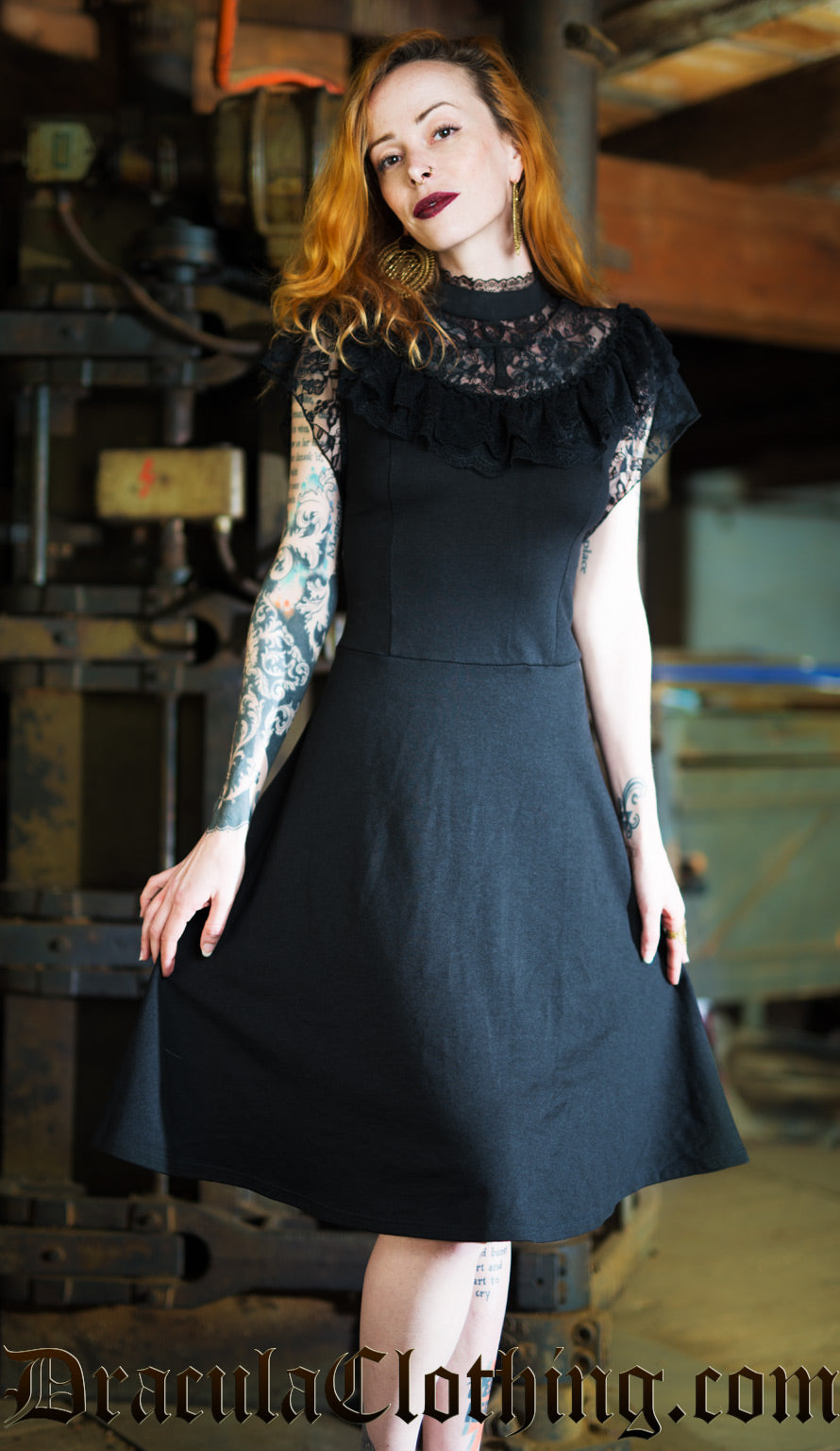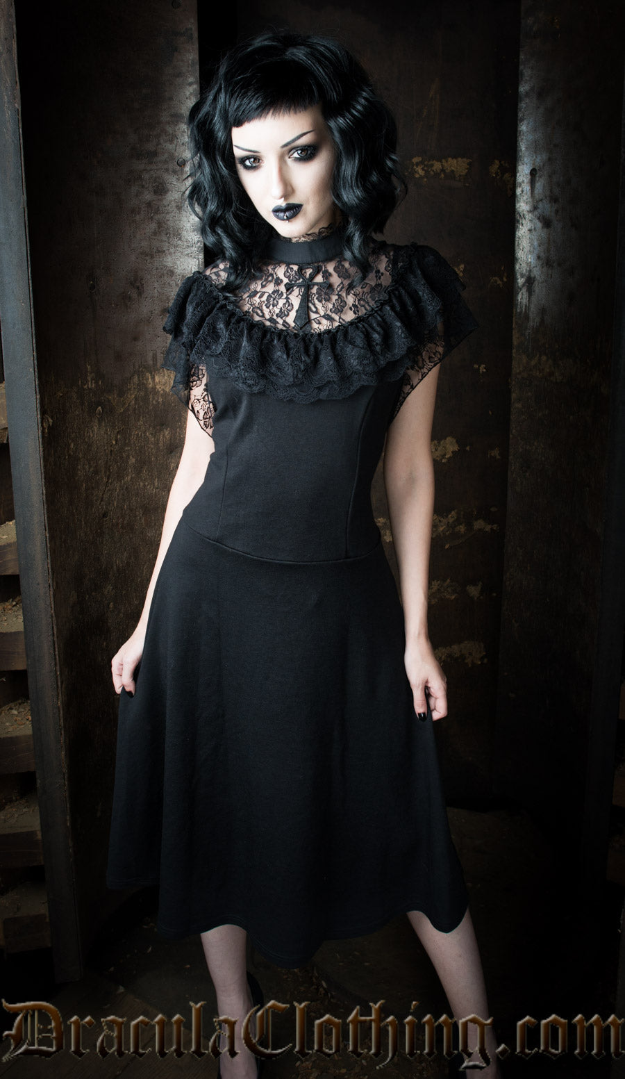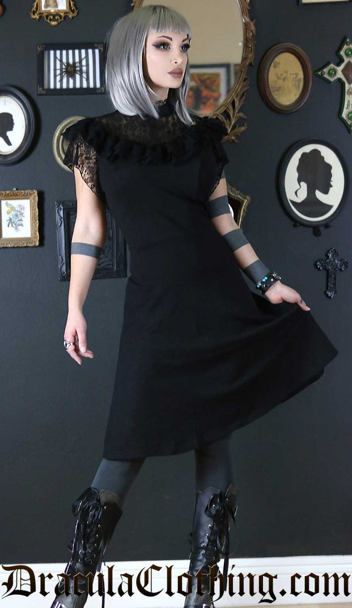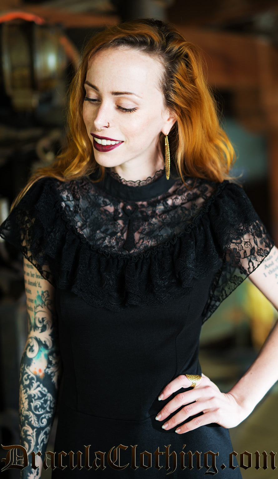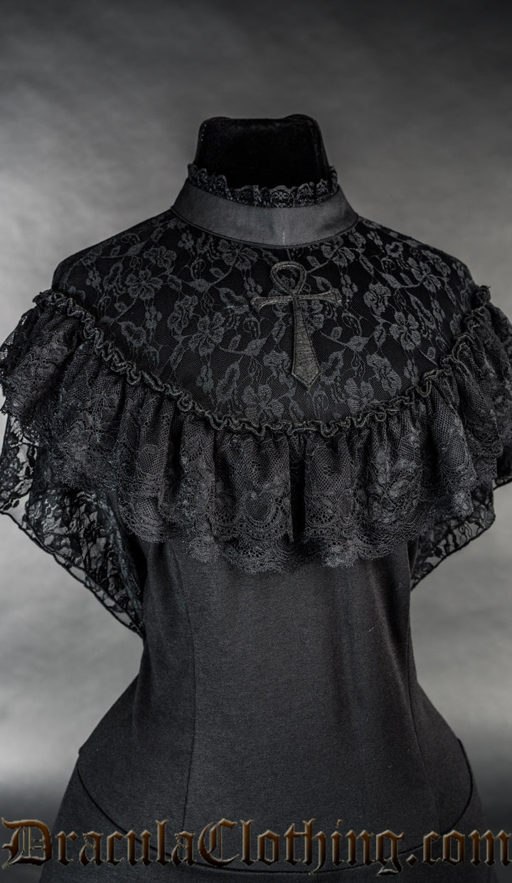 - Sheer lace chest panel featuring an ankh motif, framed by a frilled ruffle lace trim