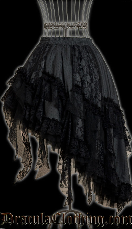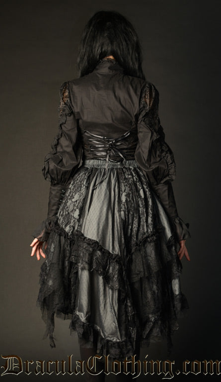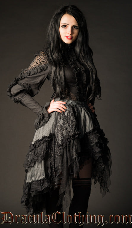 - Victorian inspired grey satin skirt with black lace details