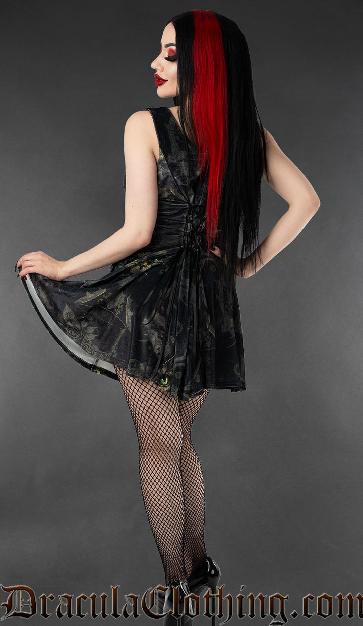 Back view of women's short velvet dress with ornate sphinx cat print and adjustable lacing in the back