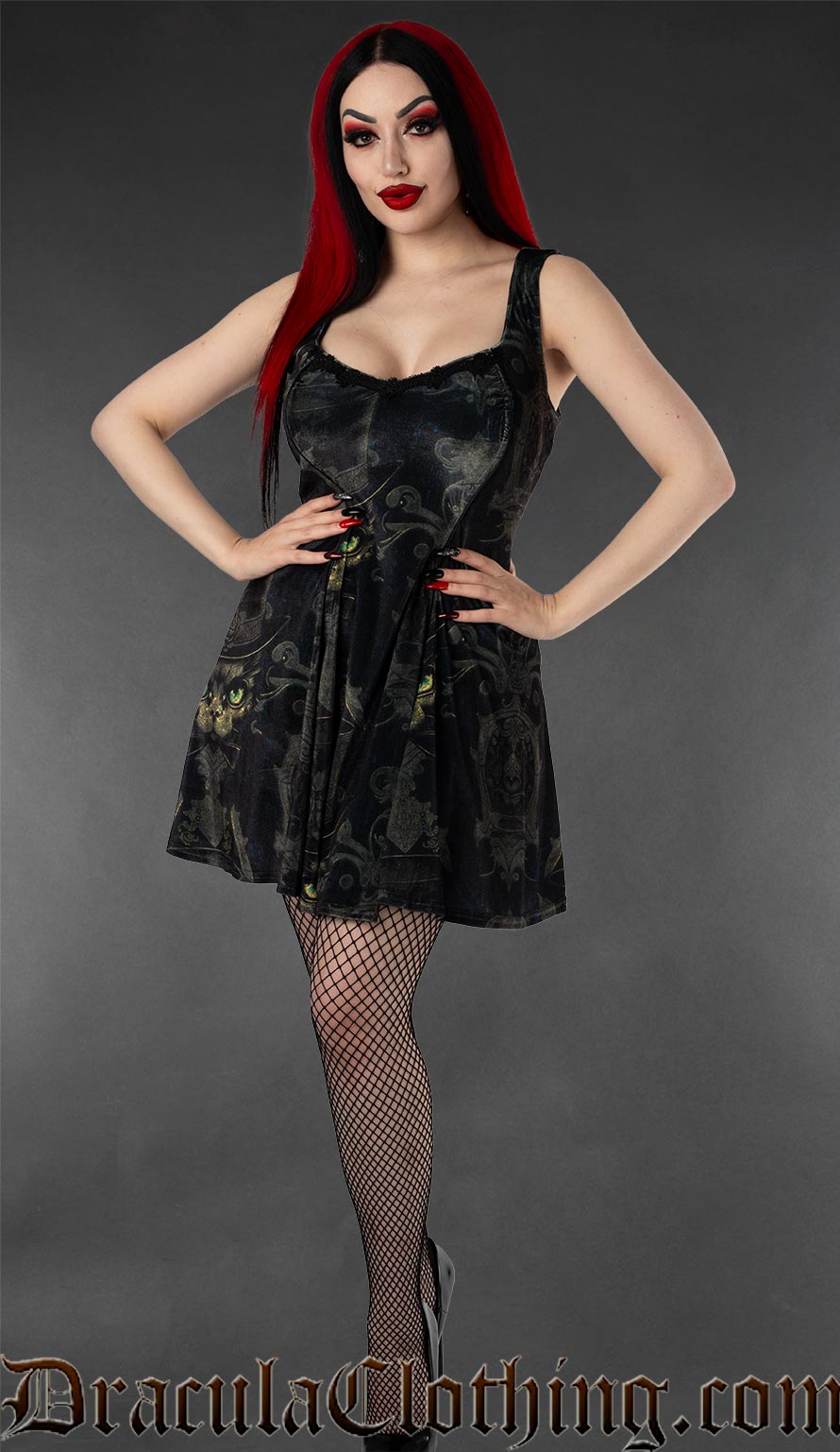 Women's short sleeveless dress with pockets made with printed velvet featuring an ornate sphinx cat design on a black background