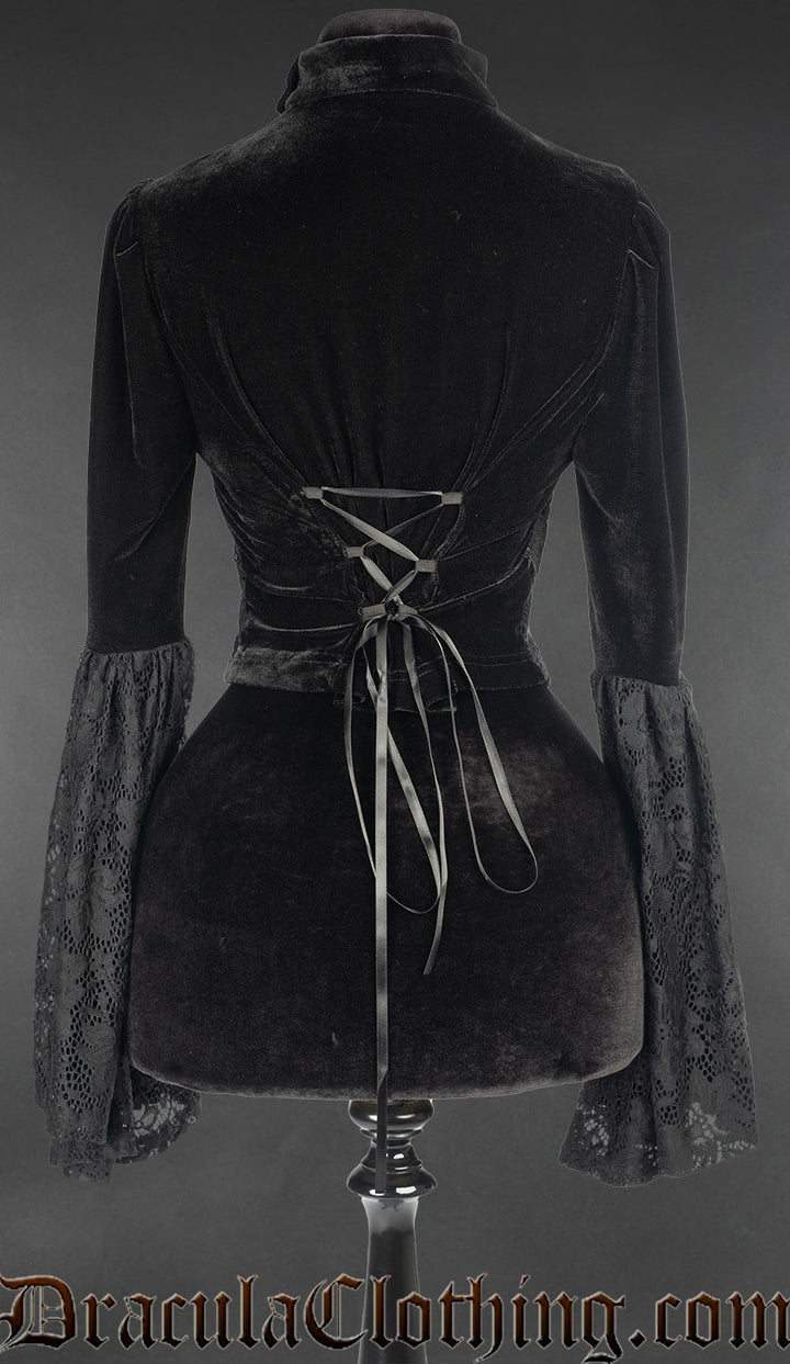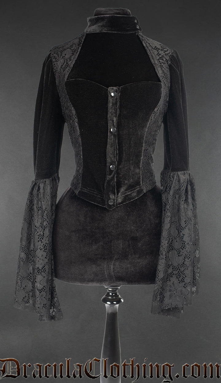Model wearing black velvet victorian jacket with black lace knee length skirt