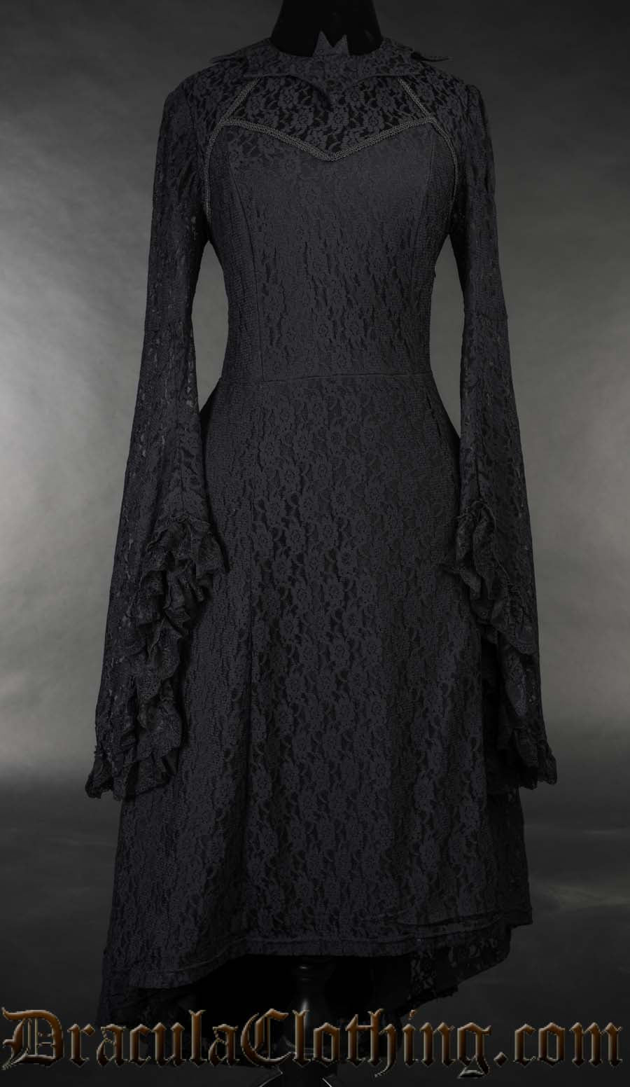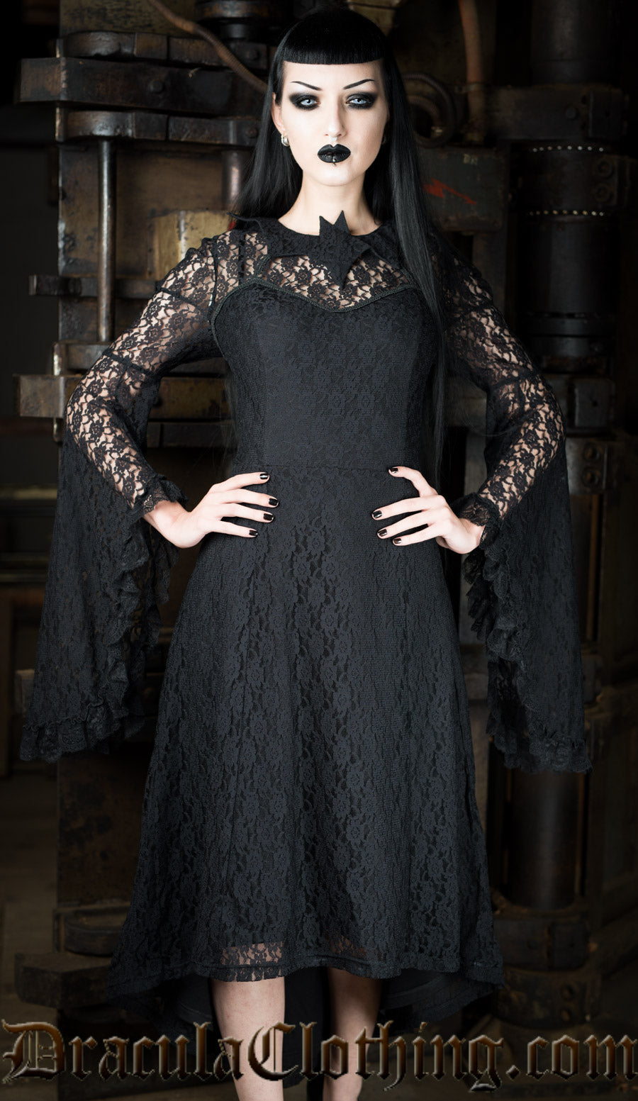 Women's black lace high low dress with dramatic trumpet sleeves and bat shaped collar