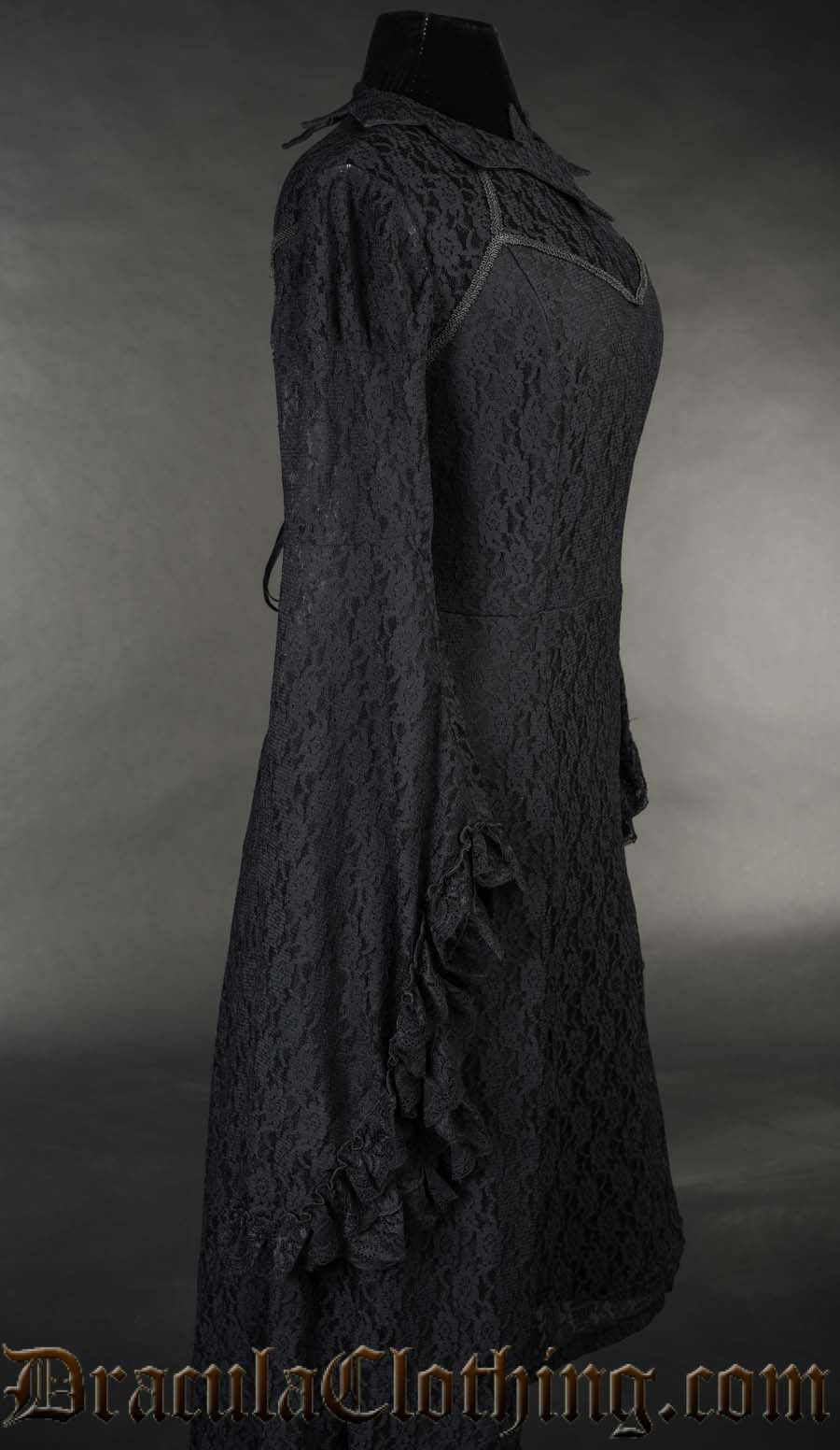 Side view of black lace dress showing largely flared trumpet sleeves made from sheer lace with a ruffled trim