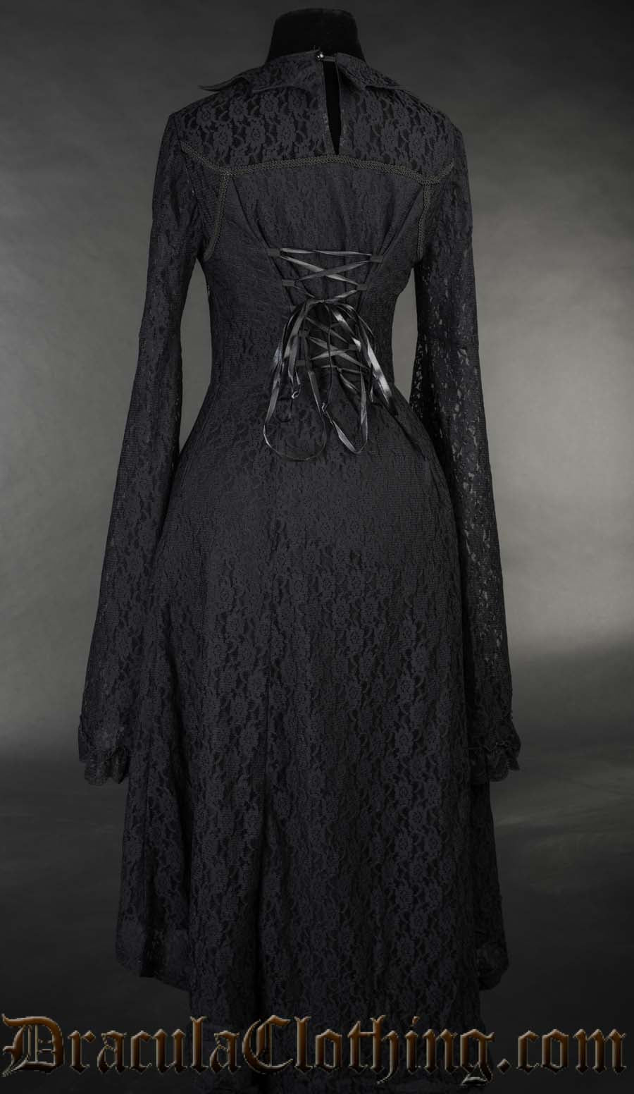 Back of black lace dress showing longer length in the back and adjustable corset style lacing in the torso