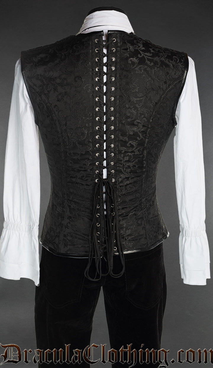 Men's black brocade v-shaper corset vest with black faux leather piping on the seams