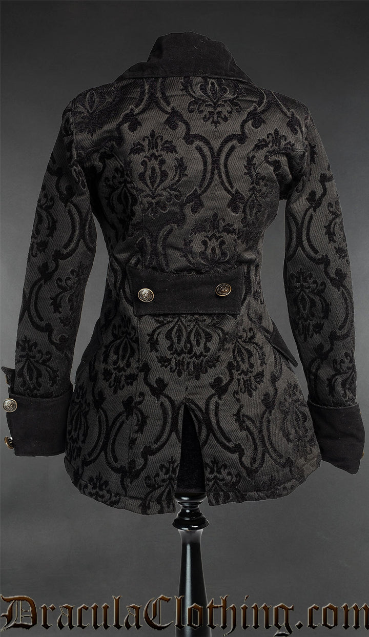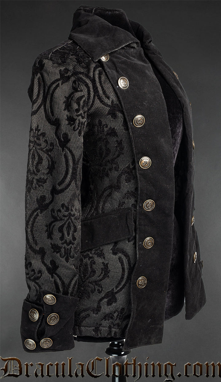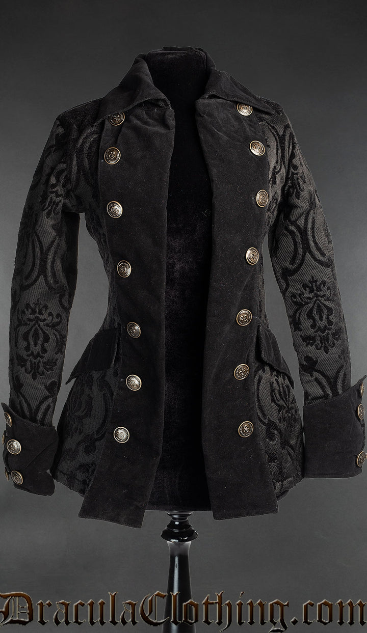 A black brocade jacket with thick velvet details, a unique pirate jacket that looks great for everyday use or for special events.