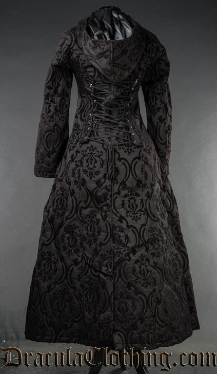 This long hooded coat is made of a thick brocade fabric and has a satin lining. It features two front side pockets, flared sleeves, and lacing in the back that can be used to tighten the coat.