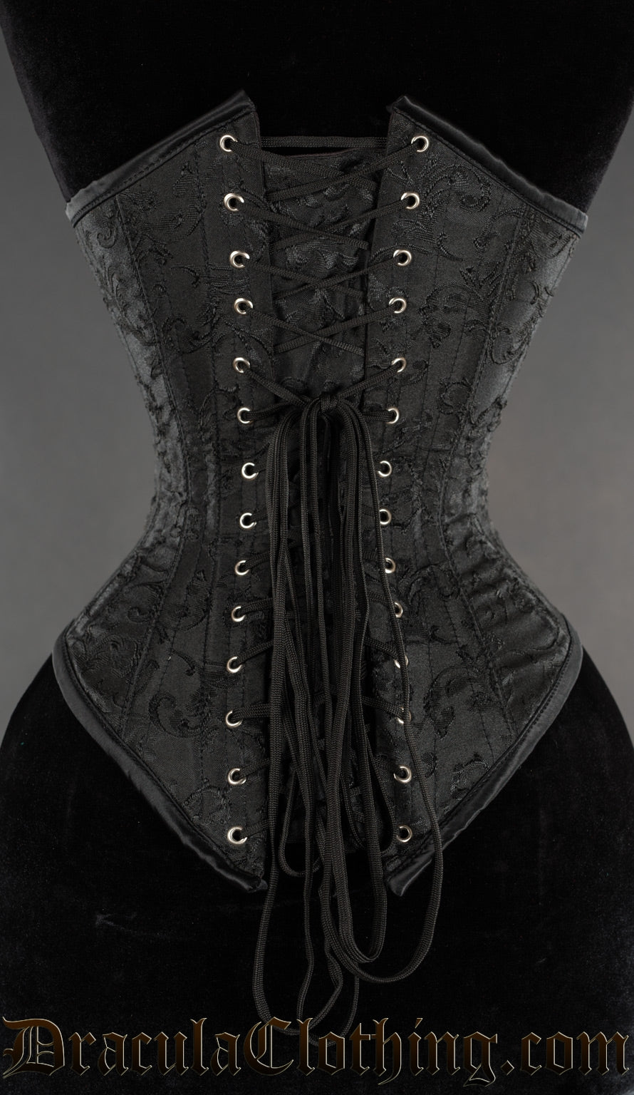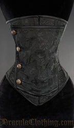 Made with high quality black brocade fabric and black satin piping on the edges. Featuring a front panel that covers the front busk, attached with gold-coloured buttons.