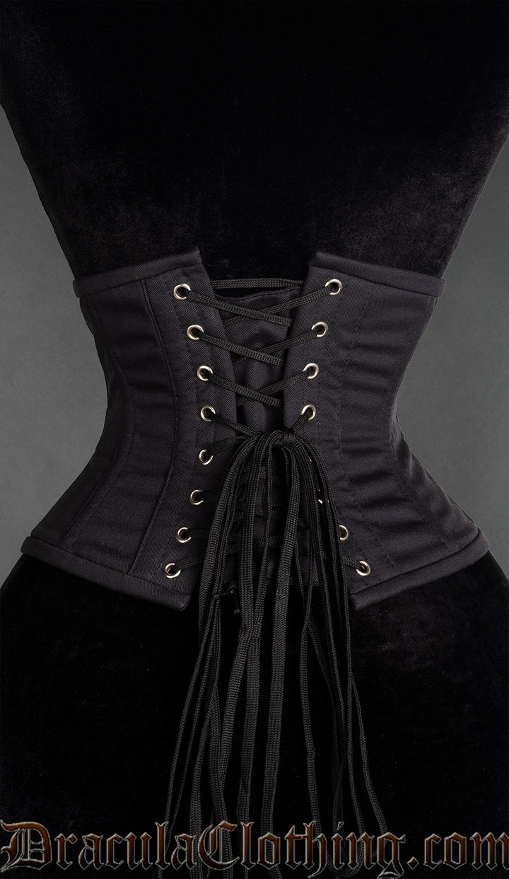 The black cotton waist cincher is made with black cotton on the outside and cotton lining on the inside.