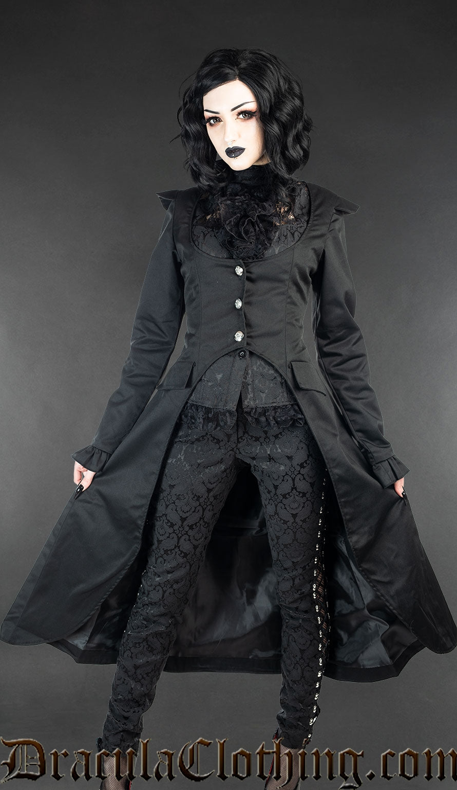 - Button fastening in the front, and adjustable corset lacing at the back