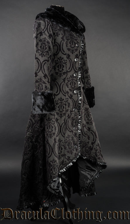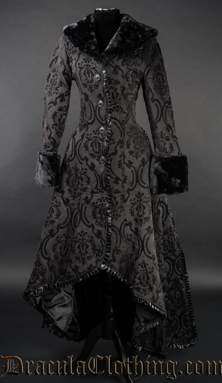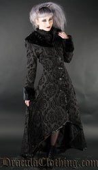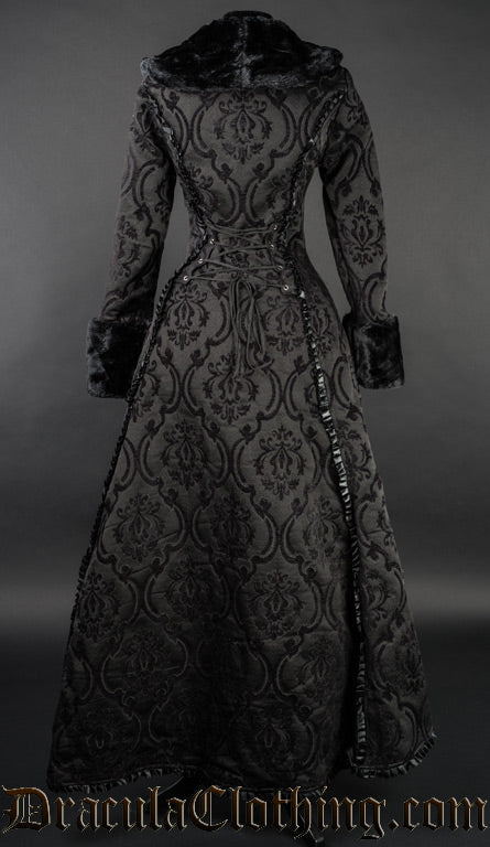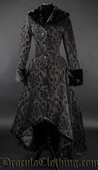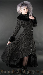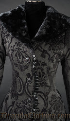 Made from thick brocade fabric and accented with faux fur, this winter coat will keep you warm and stylish. The brocade is custom made for us. It is a rich, black jacquard made in two layers, the first layer has a slightly velvety look, and the black is woven over the black base material to create a super thick heavy brocade fabric.