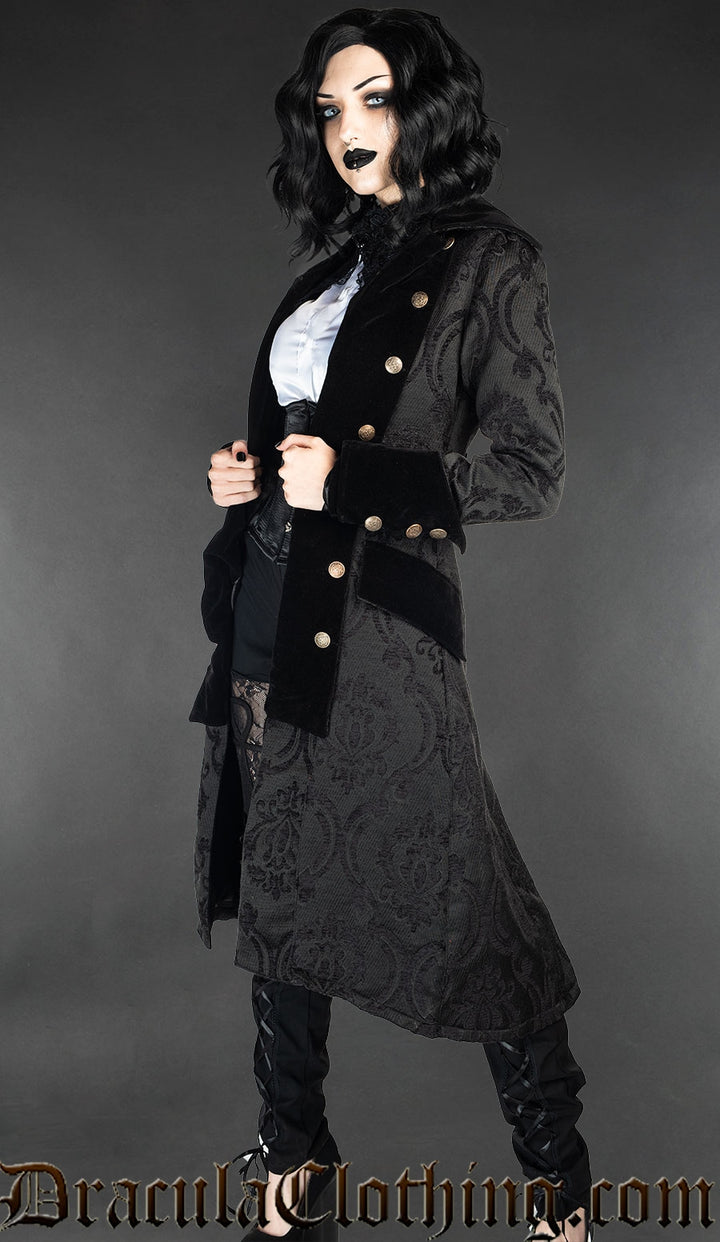 Women's pirate inspired coat made in an open double breasted design with thick cotton jacquard in a damask brocade pattern and velvet accents
