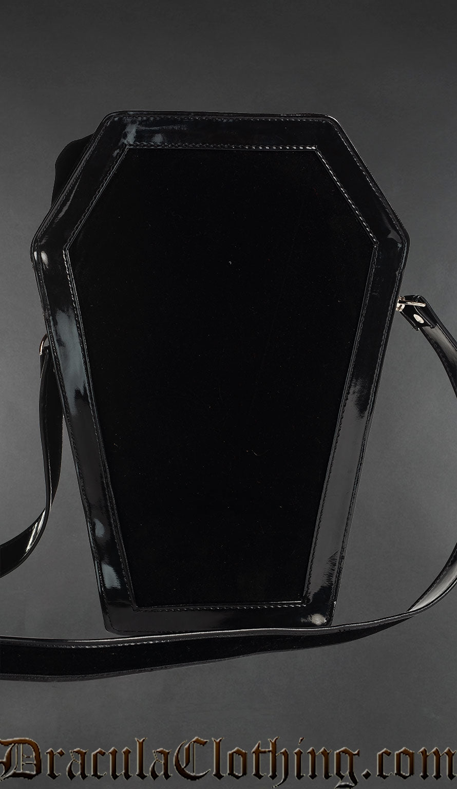It has black velvet fabric with PVC details, with one big compartment and one small compartment inside.