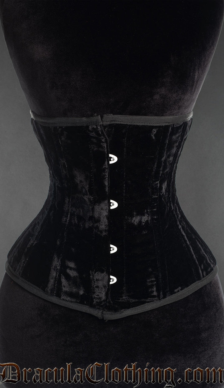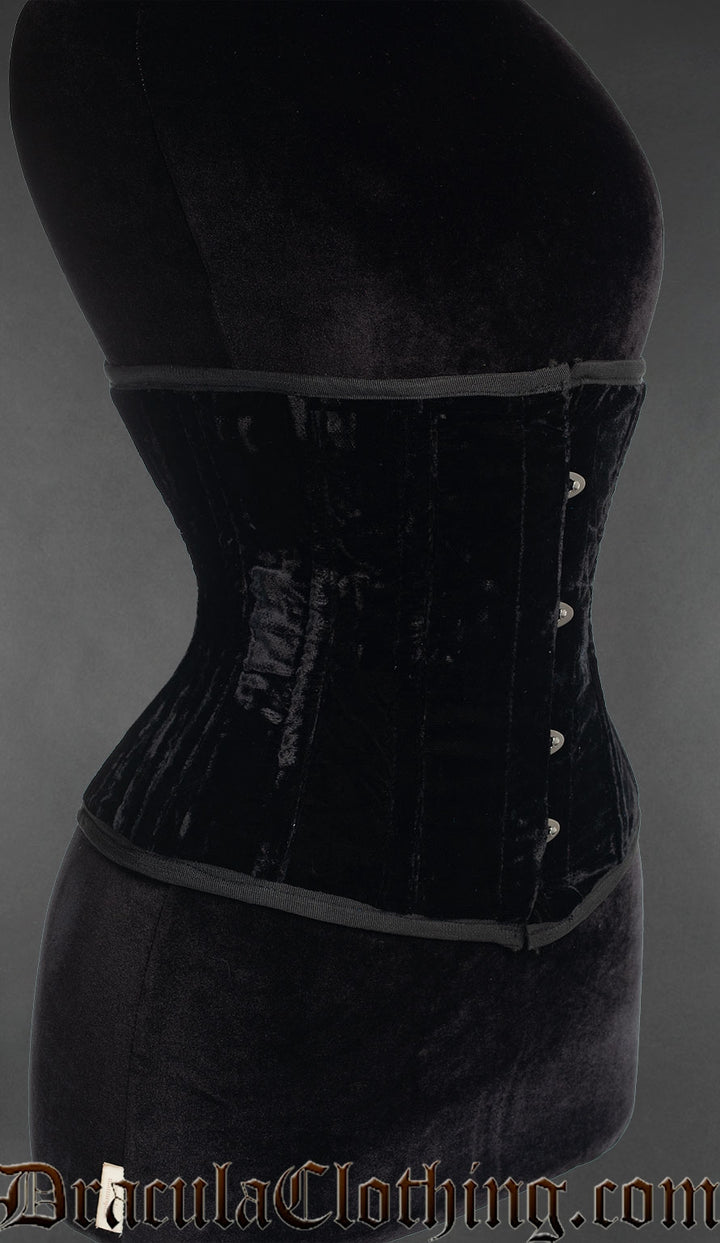 This waspie corset is crafted with a deep black velvet and lined with comfortable and durable black cotton inside. Adds extra flair to any outfit, and looks great when worn alongside our Gentlemen's velvet formal wear as a matching couple outfit.