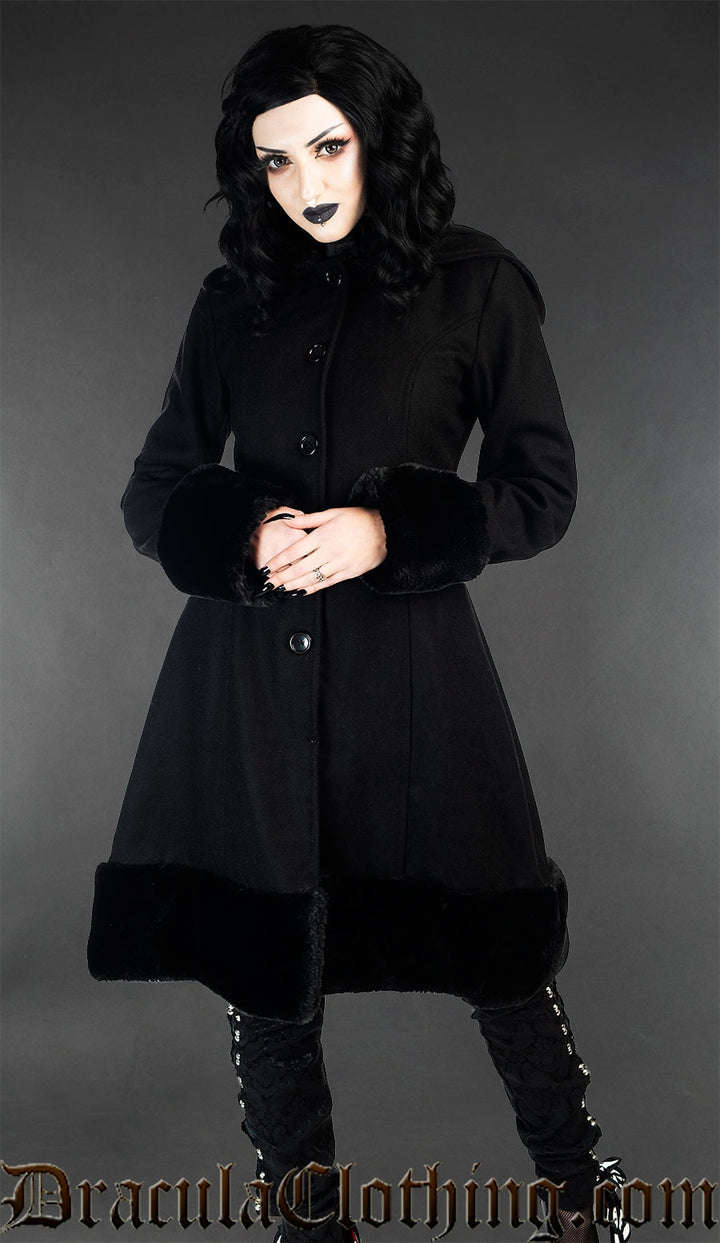This amazing coat features a removable cape and extra large hood - every hair will fit inside! It's made from a wool material, with quality fleece lining, and cuffs, collar and bottom trim in faux fur. With the lacing in the back, the coat can be tightened about 16 cm in the waist.