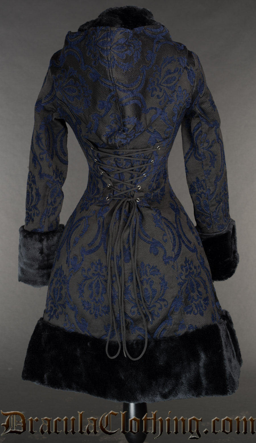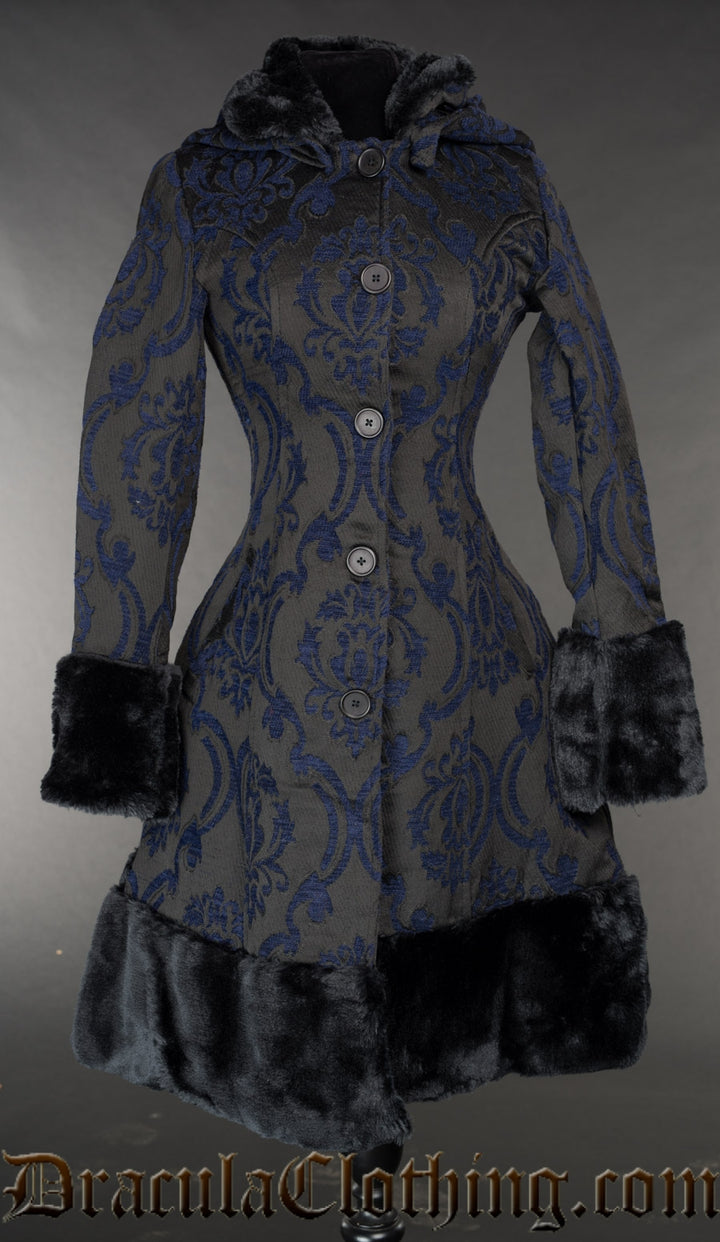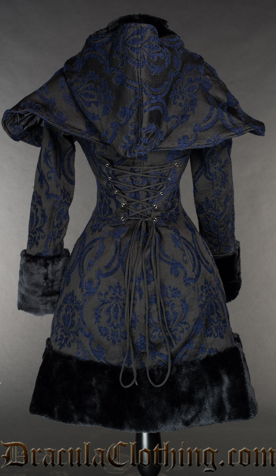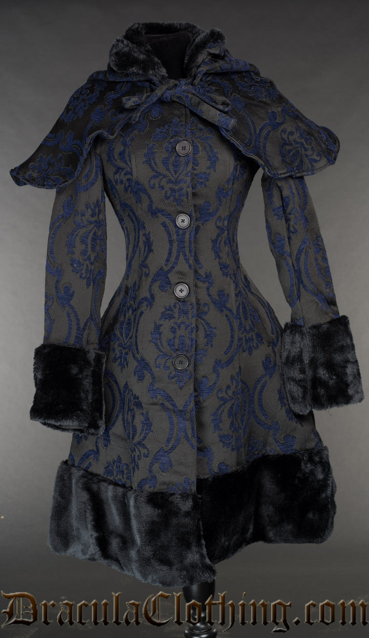 Black and blue brocade winter coat with a removable hood and cape. It has faux fur on the sleeves and around the neck. We have custom made the brocade fabric for a unique look.