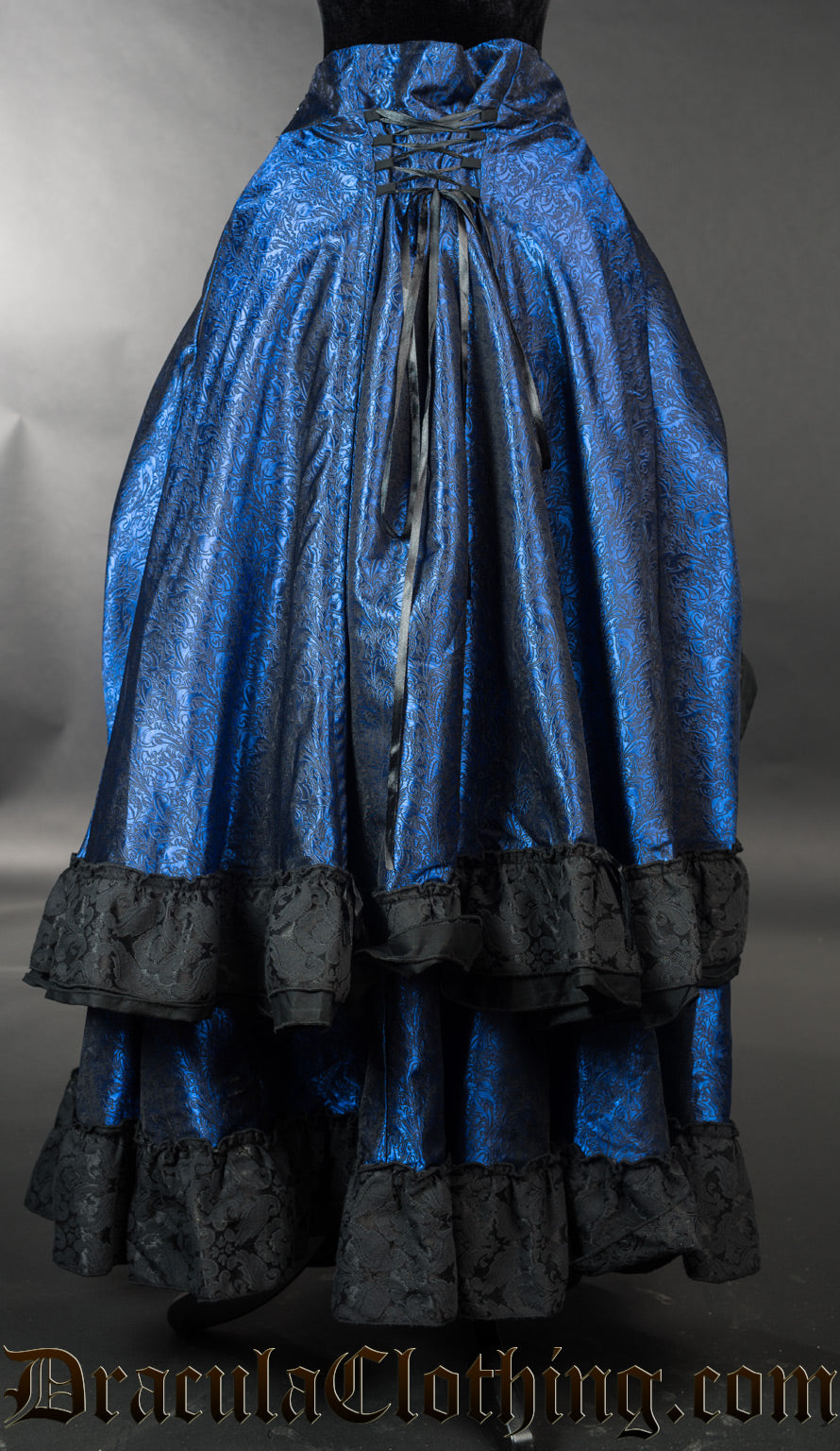 - Lustrous blue skirt with black brocade accents at the hem of each layer