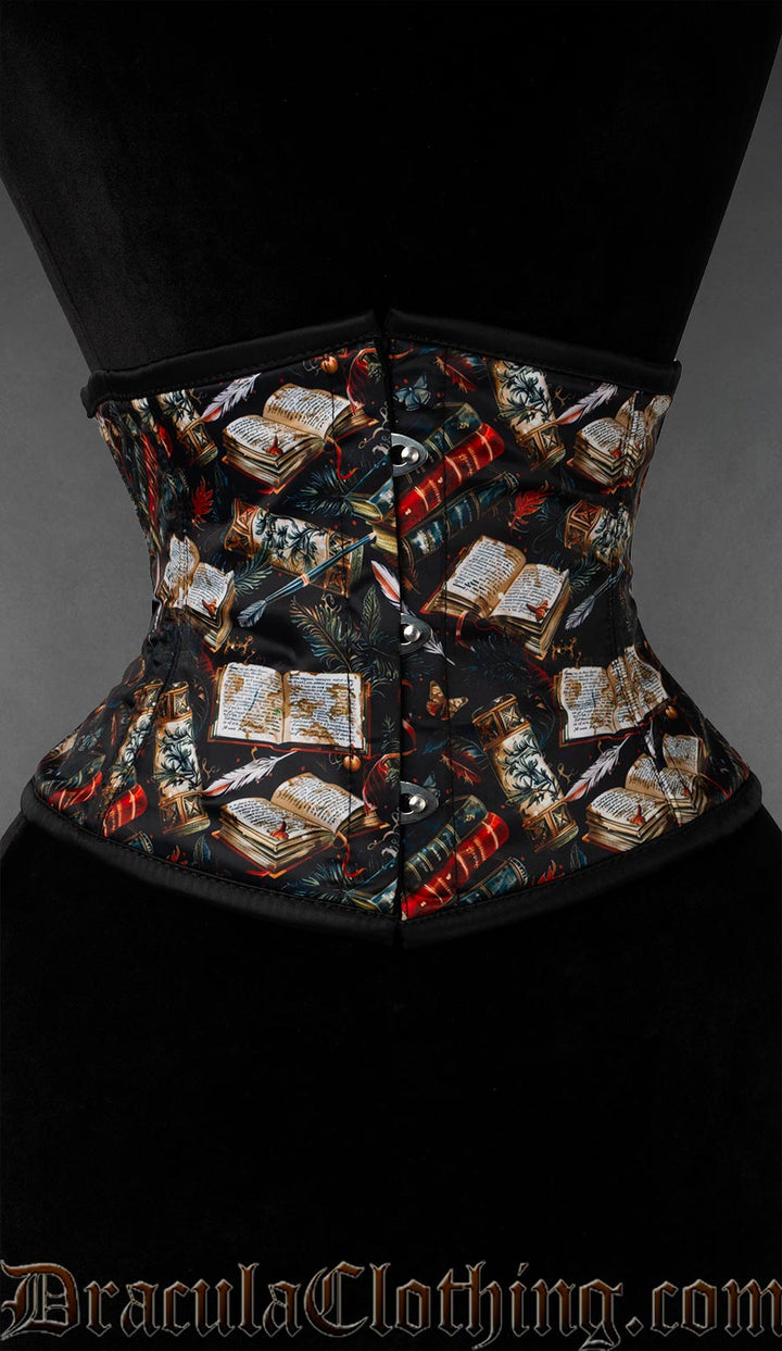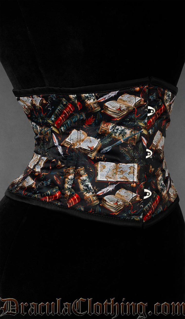 The books waist cincher is made with the satin books print on the outside and cotton lining on the inside.