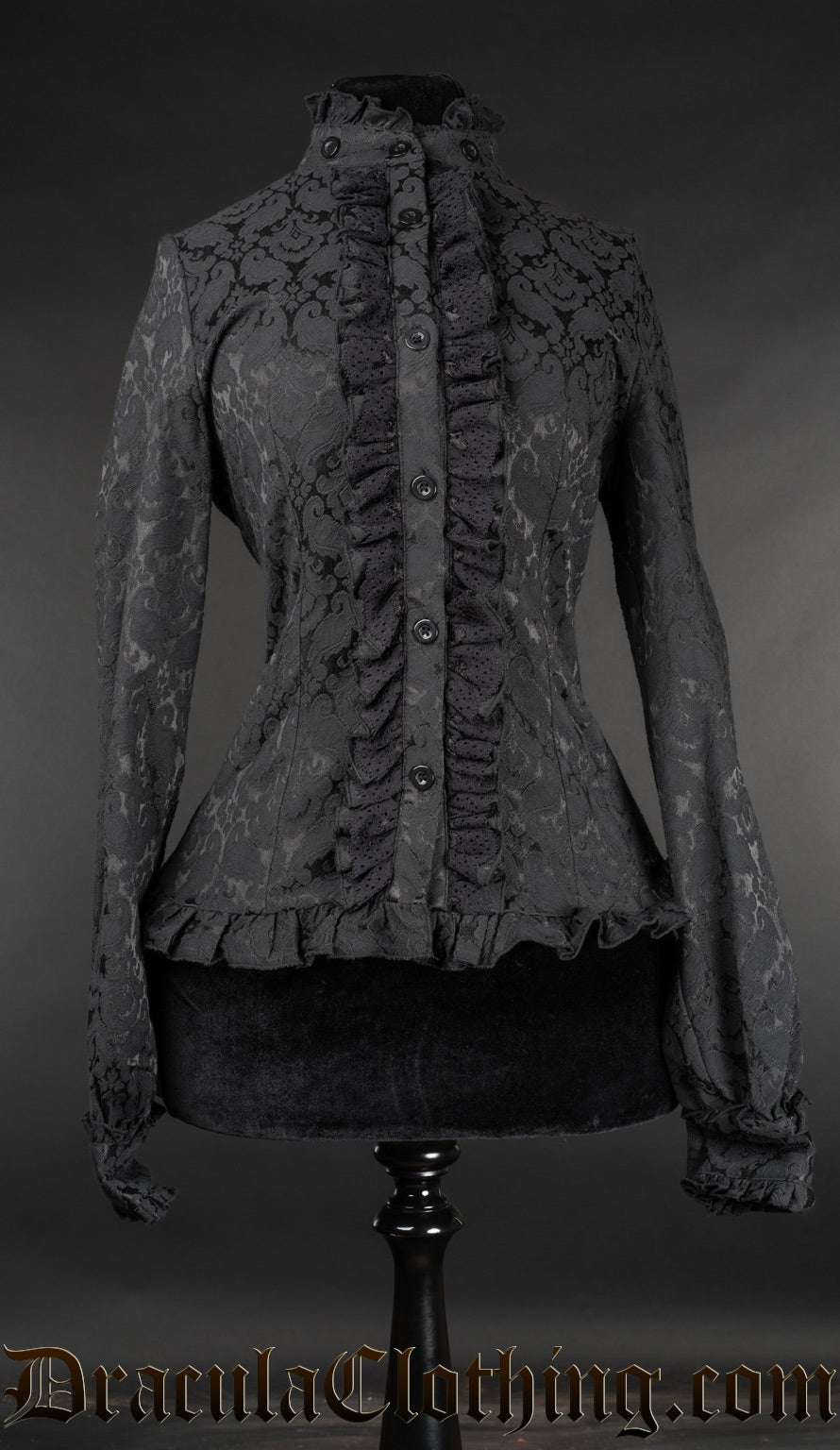 • High collar, black brocade button down blouse