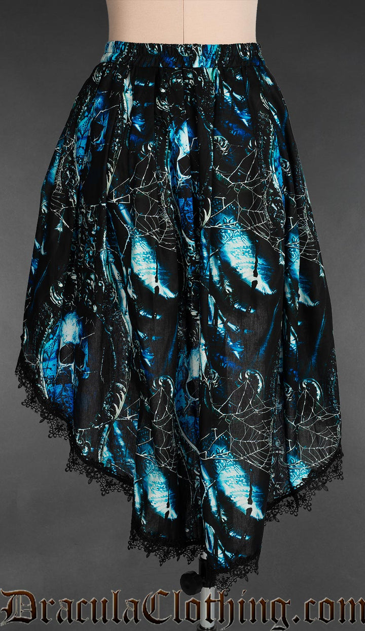 Back view of women's high low skirt with black lace trim and blue and black pirate skull inspired print