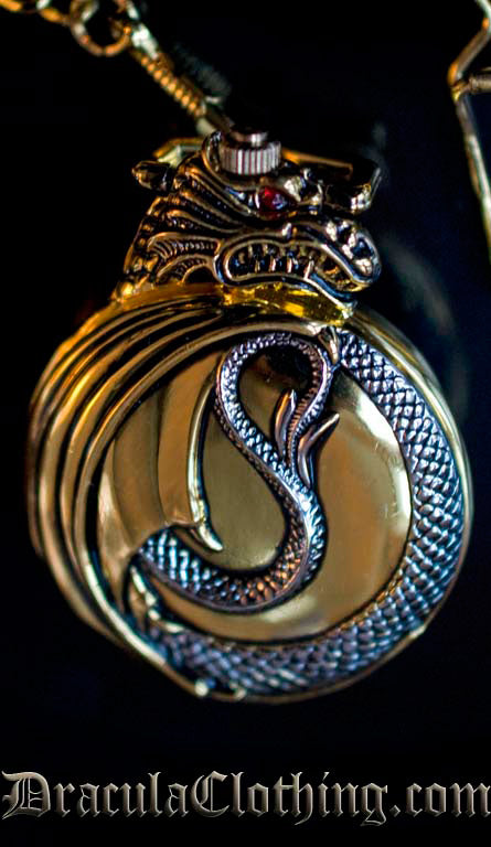 Dragon watch with a curling dragon on the back and front and a prismatic front that look black in some lights and red in other lights.