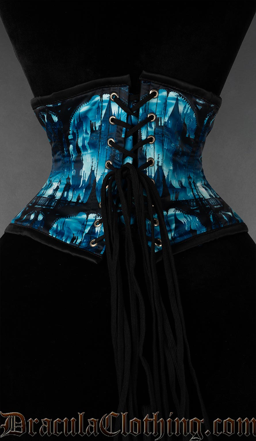 The dusk city waist cincher is made with the city print on the outside and cotton lining on the inside.
