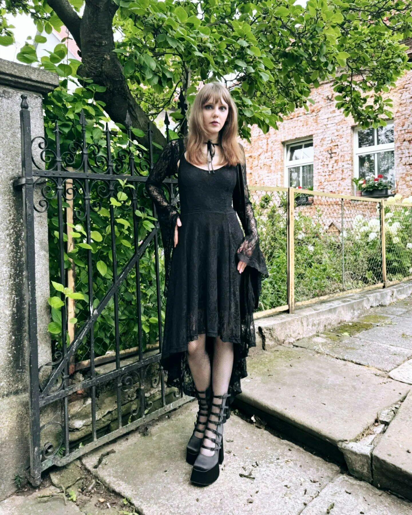 Black lace high low women's dress worn by a model with detachable lace long trumpet sleeve bolero