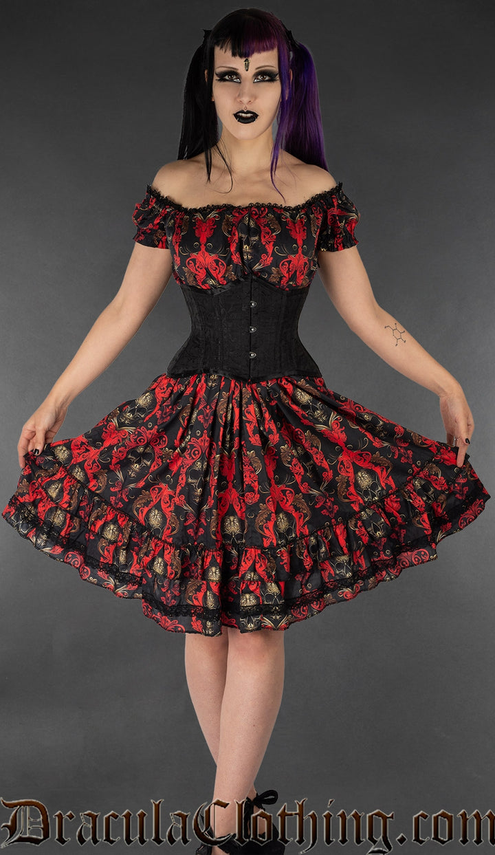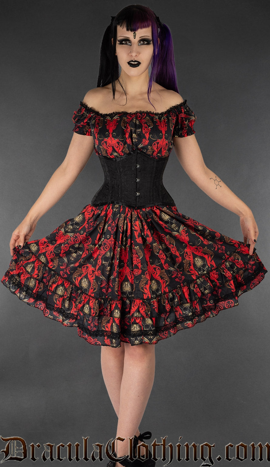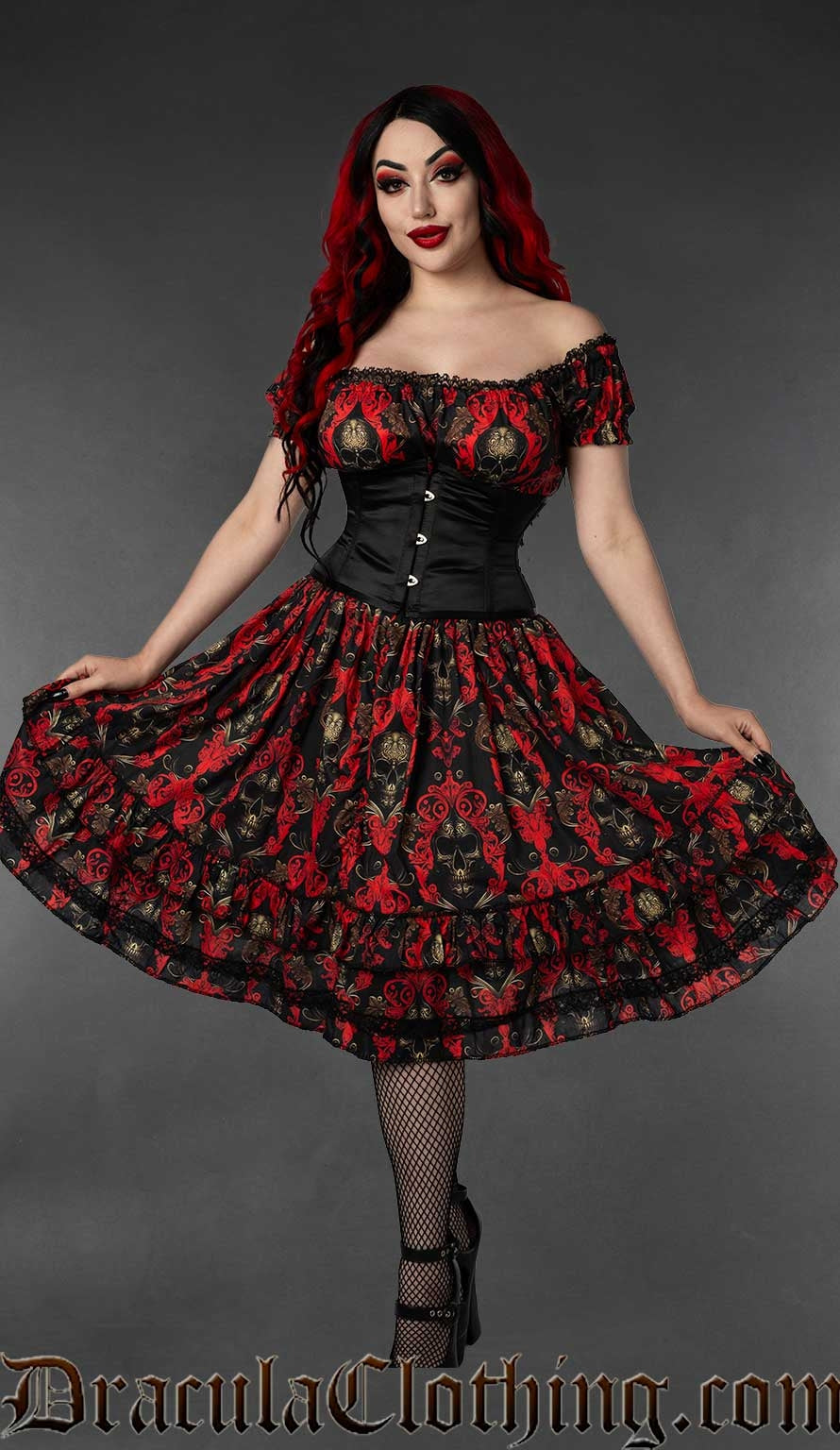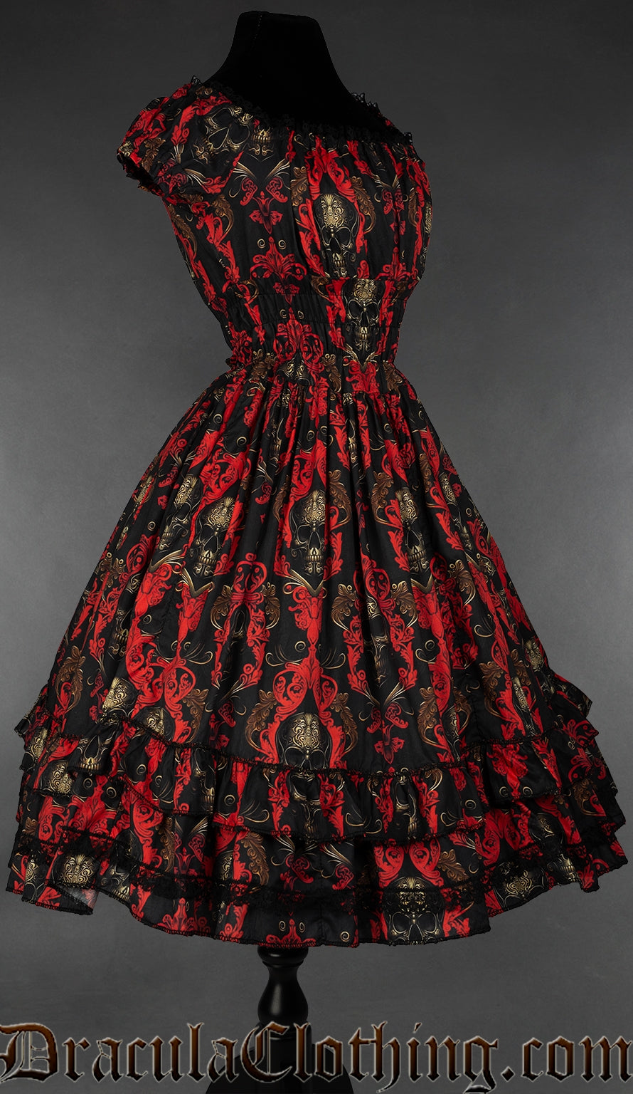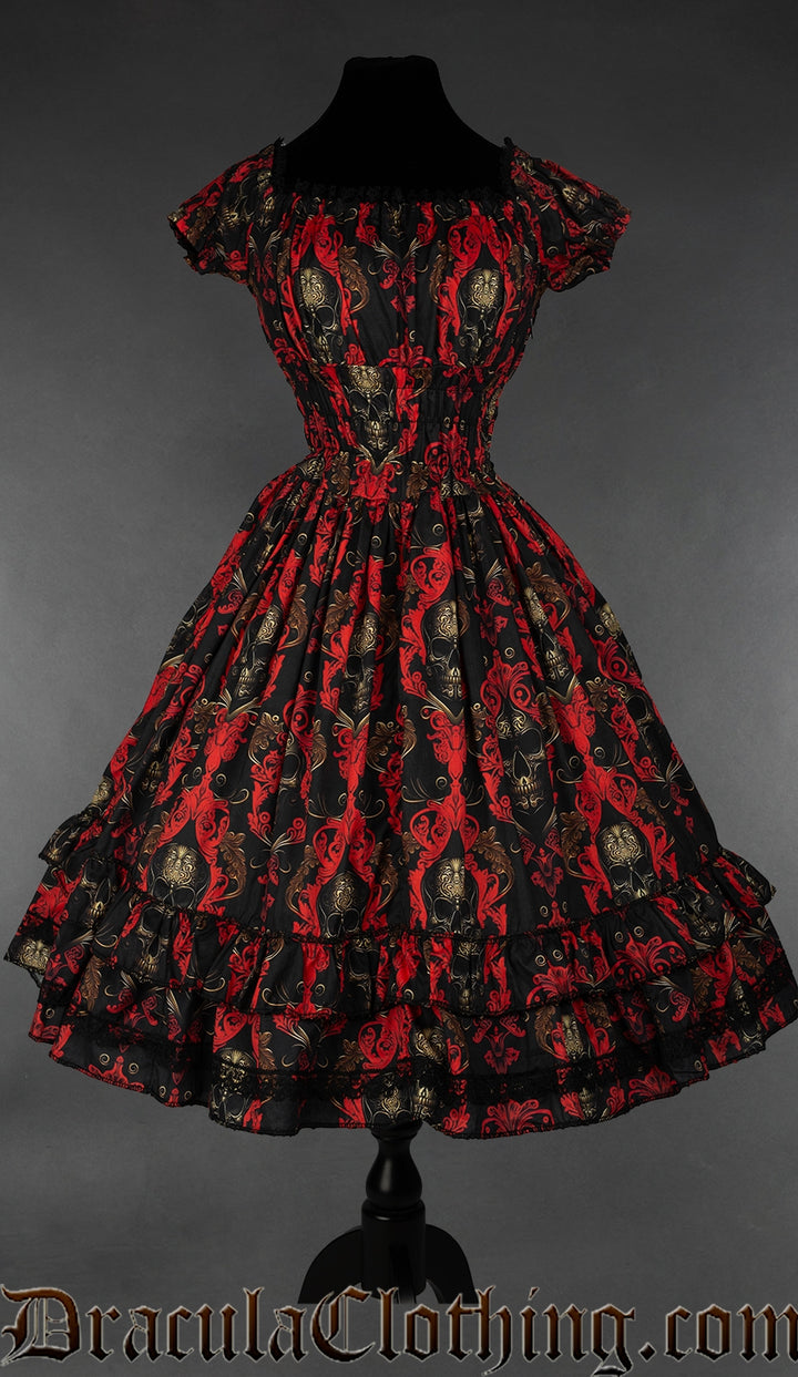 This dress is inspired by vintage clothing with a gothic edge. This print is inspired by elegy poems. Elegy poems are about death and loss, and this print features ornate skulls and red filigree details on a black background.