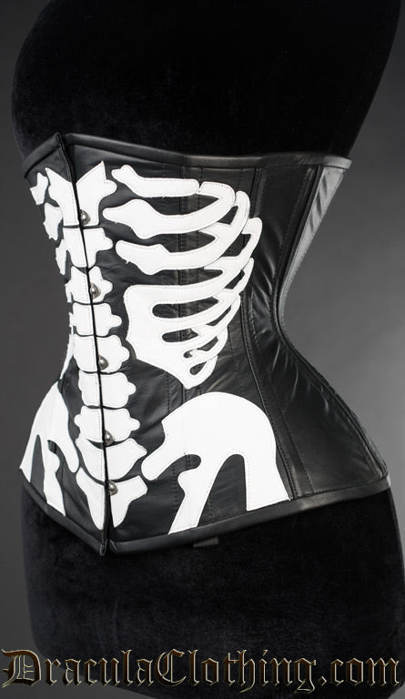 Side view of women's black and white faux leather skeleton underbust corset showing shaping