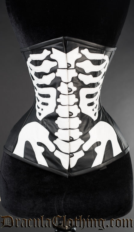 Model wearing black faux leather corset with white skeleton design on an underbust style