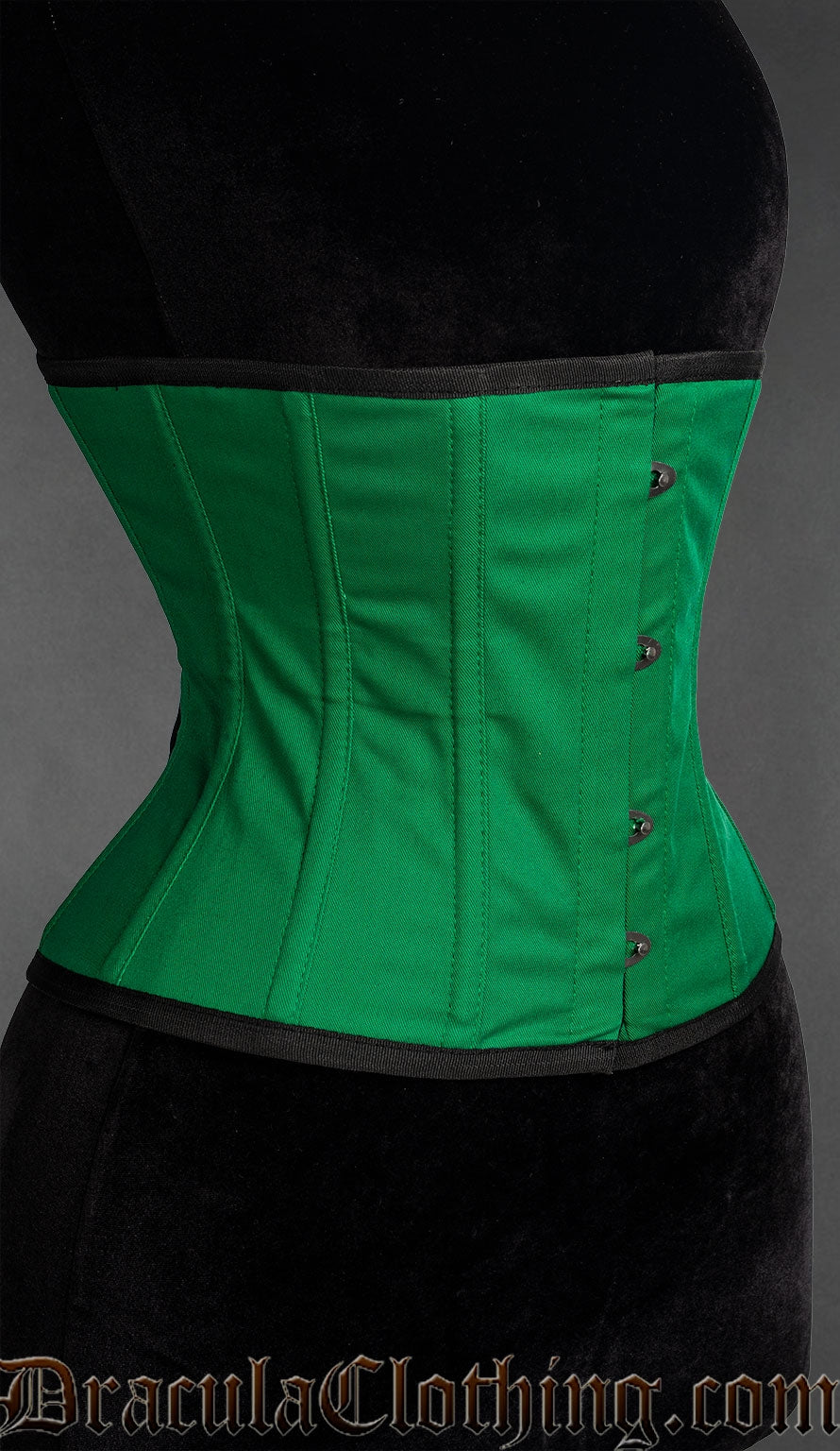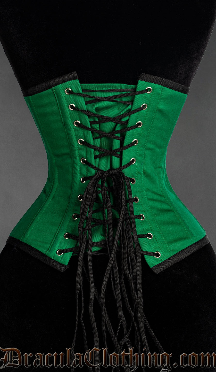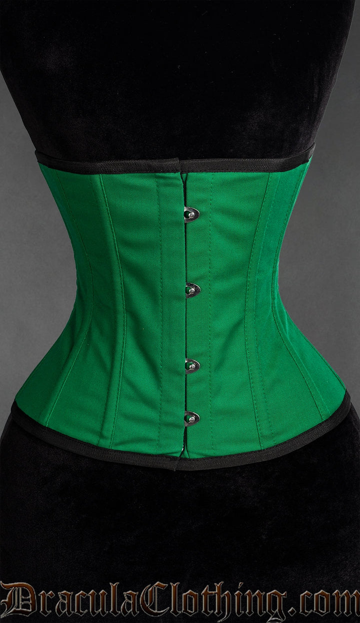 This waspie corset is crafted with high quality green cotton on the outside and lined with comfortable, durable cotton inside.
