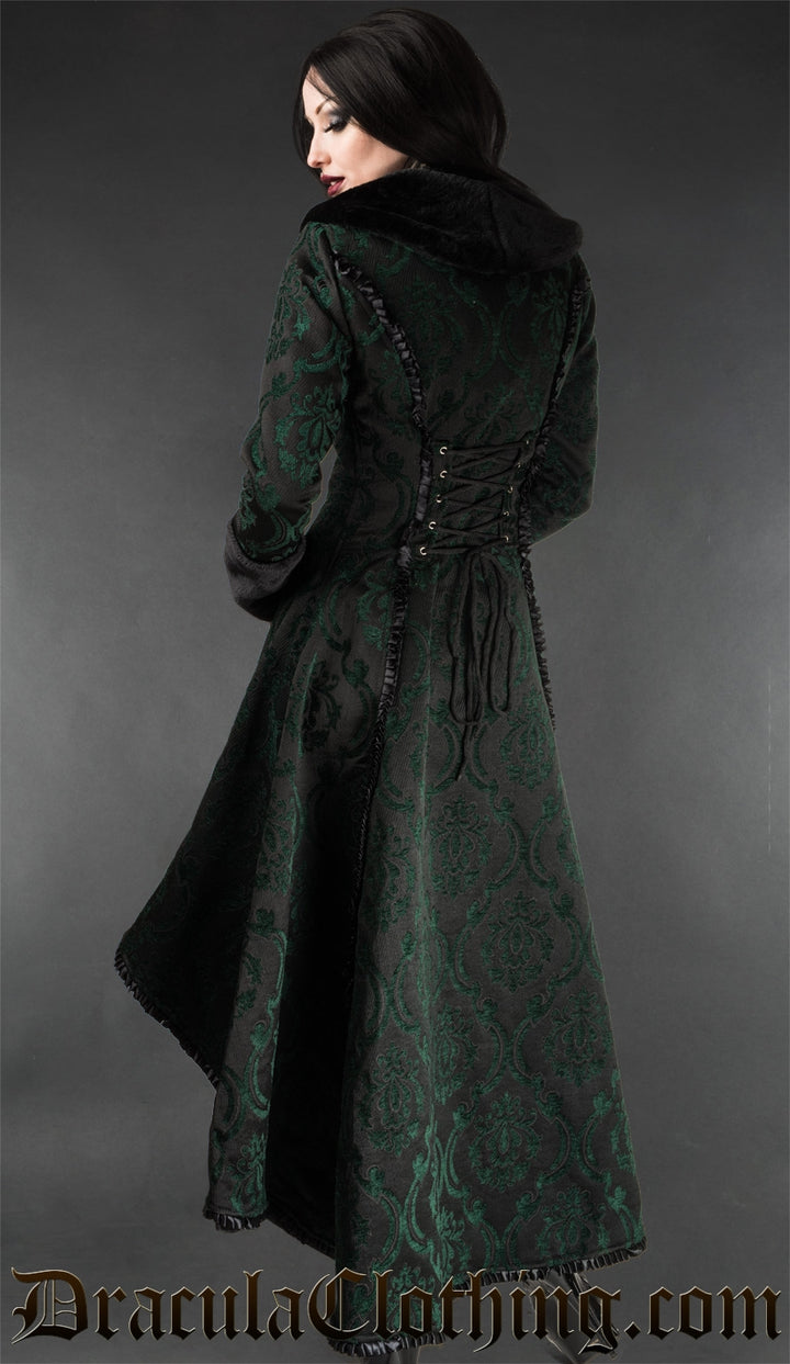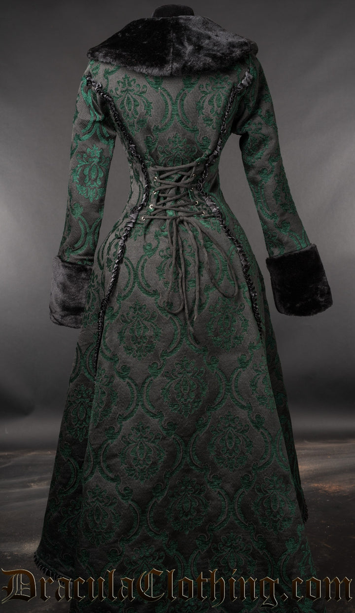 Back view of women's green and black brocade coat showing adjustable corset style lacing in the torso satin trim details and faux fur accent collar