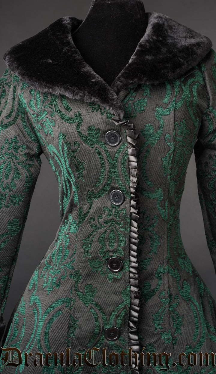 Women's high low winter coat made with black and green brocade jacquard in a damask pattern with black faux fur accents