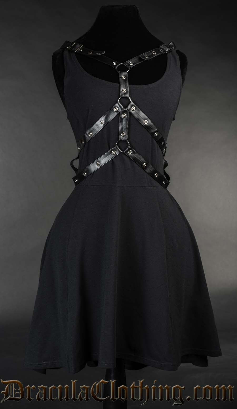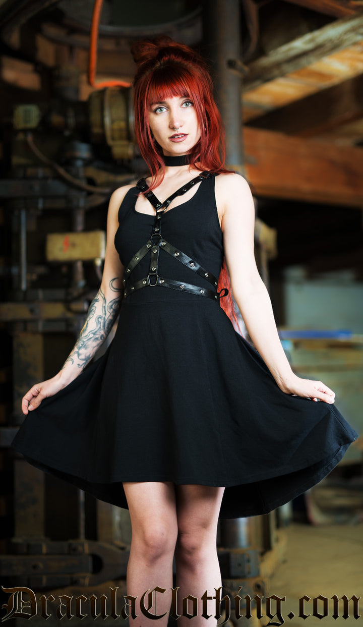 Model wearing black cotton over knee dress with detachable faux leather harness