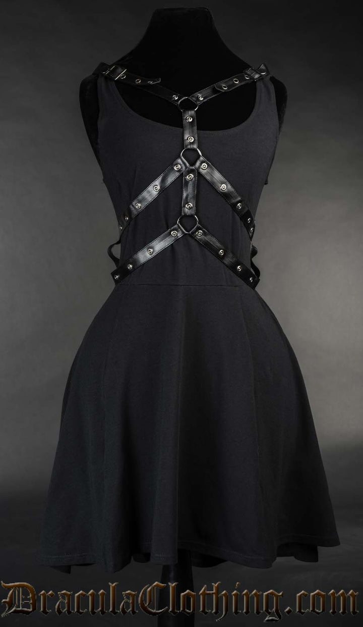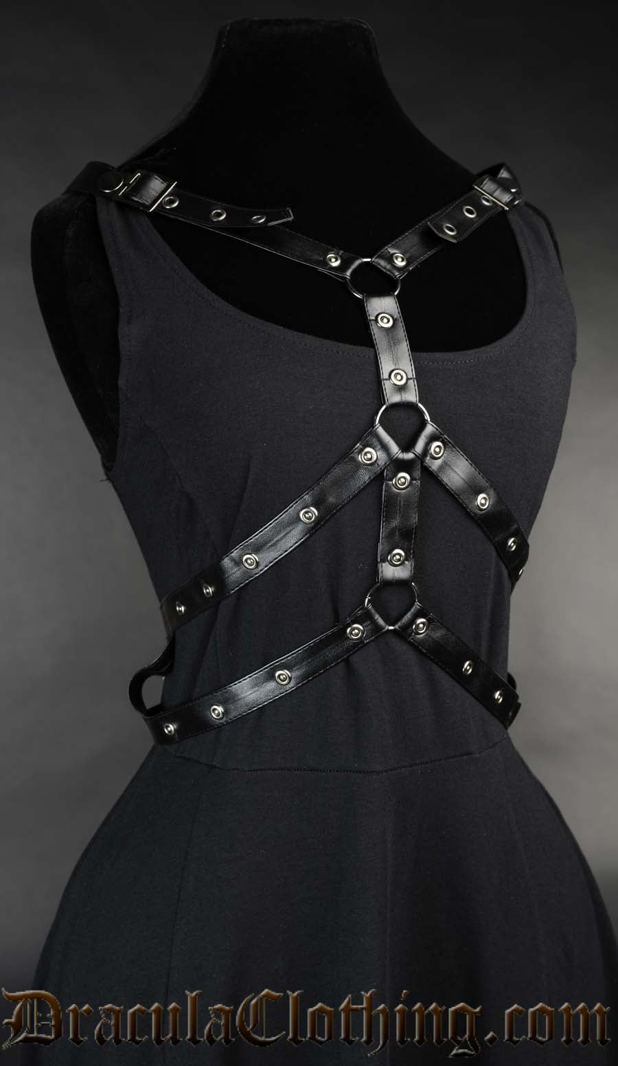 Close up of black faux leather harness on women's black cotton dress hsowing silver studs and o-rings