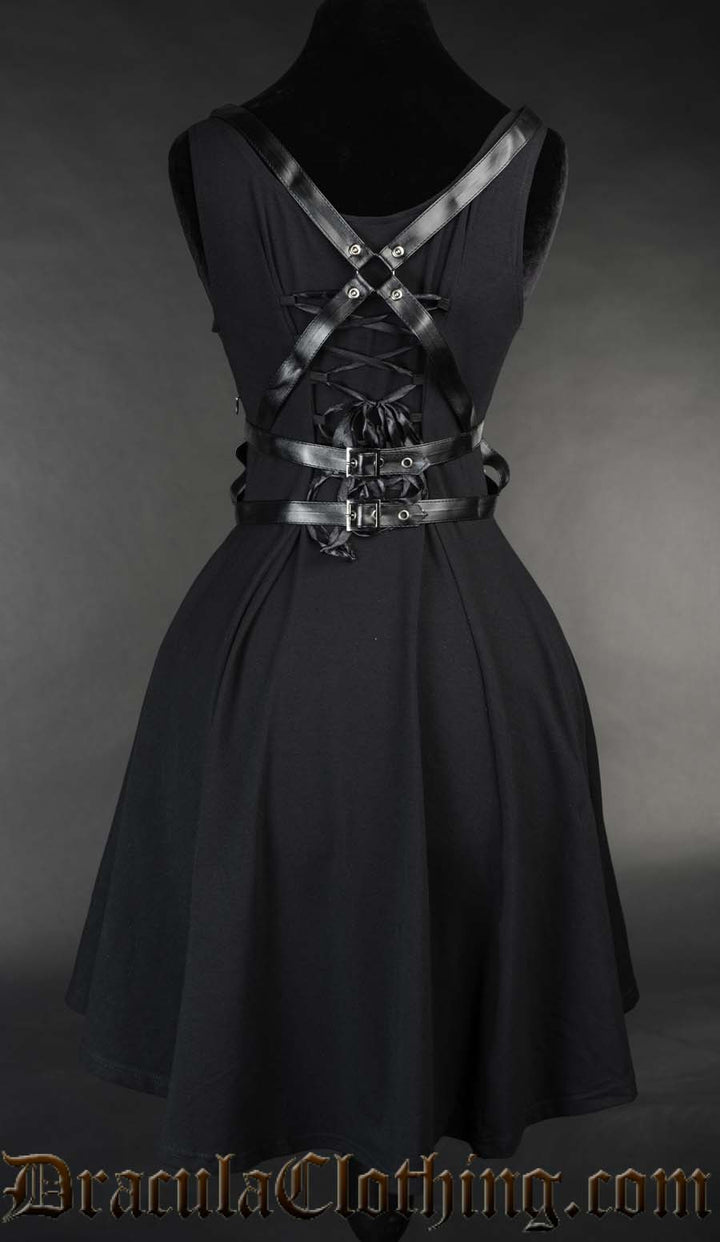 Back of black cotton dress showing back of faux leather harness and adjustable corset style lacing