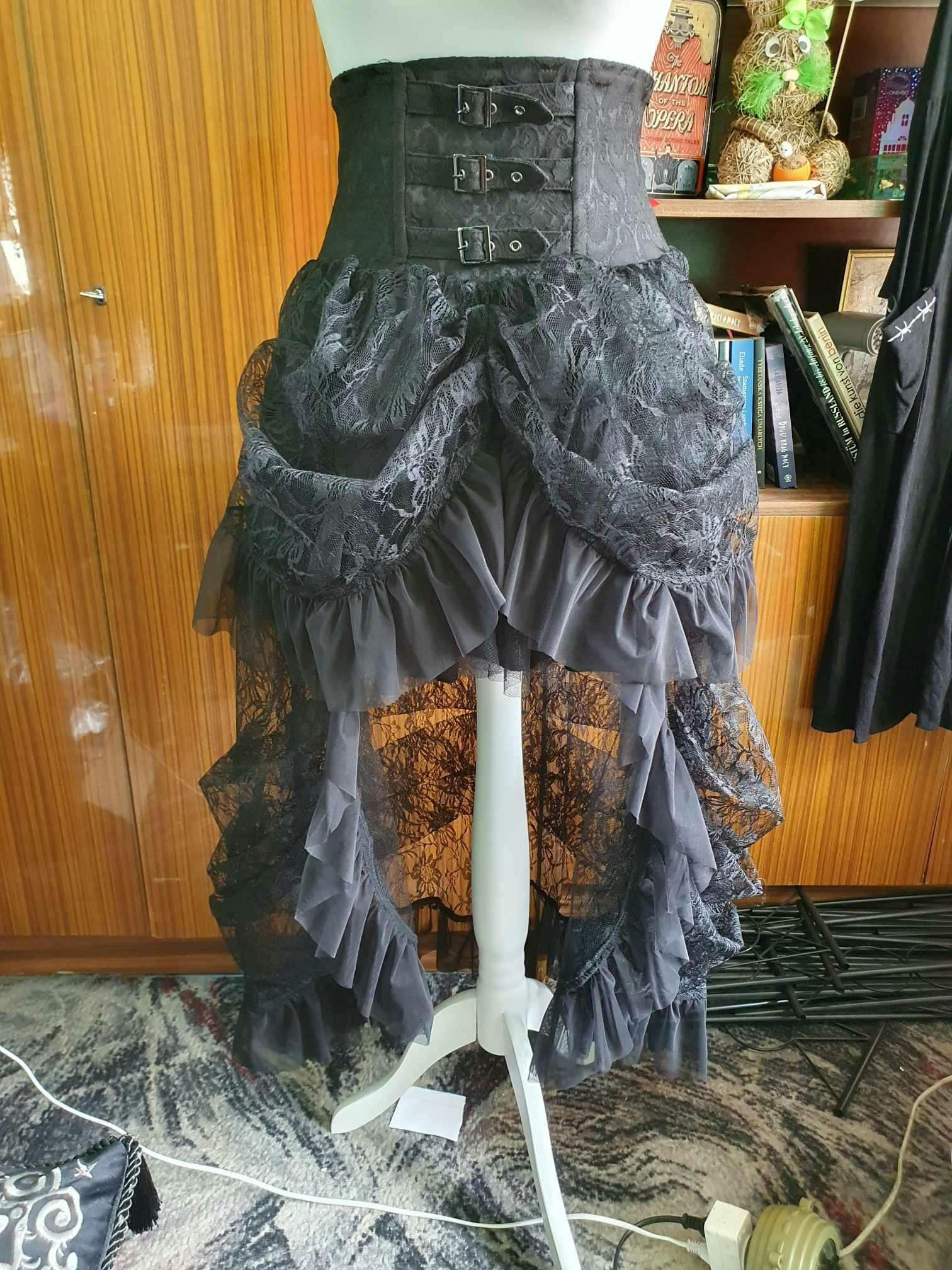 Black women's bustle skirt with many layers of fabric and high waist design with three adjustable buckles