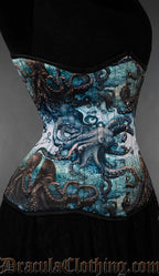 The kraken extreme waist corset is made with satin kraken print on the outside and thick black cotton lining on the inside.